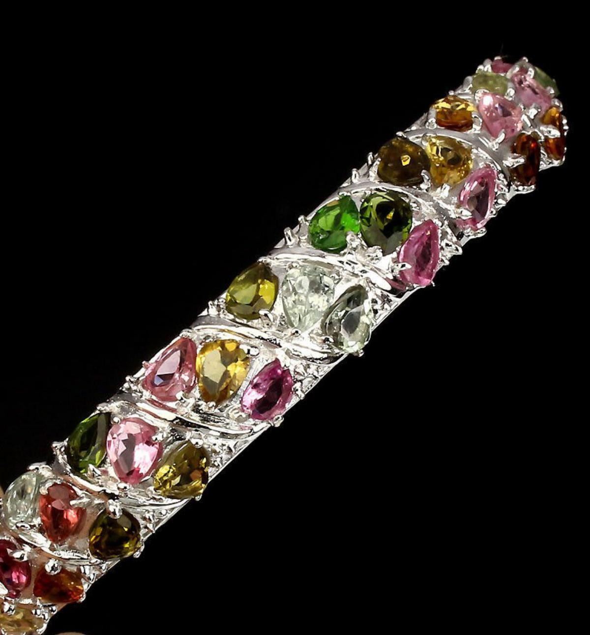 925 STERLING SILVER;PLATE...14K WHITE GOLD;MAIN STONETOURMALINE;TOTAL WEIGHT129.66 CT (TOTAL WEIGHT OF SILVER + STONE)DIMENSION* STONE 5.0 X 3.0 MM. * DIAMETER 2.3 INCHES. * FACE BANGLE 68.0 X 10.0 MM.;MAIN STONE SHAPEPEAR CUT;MAIN STONE COLORTOP FANCY COLORS;CLARITY/GRADEIF TO VVS;LUSTERMESMERIZING;TREATMENTUNHEATED;ORIGINBRAZIL;HARDNESS7.0 - 7.5;
