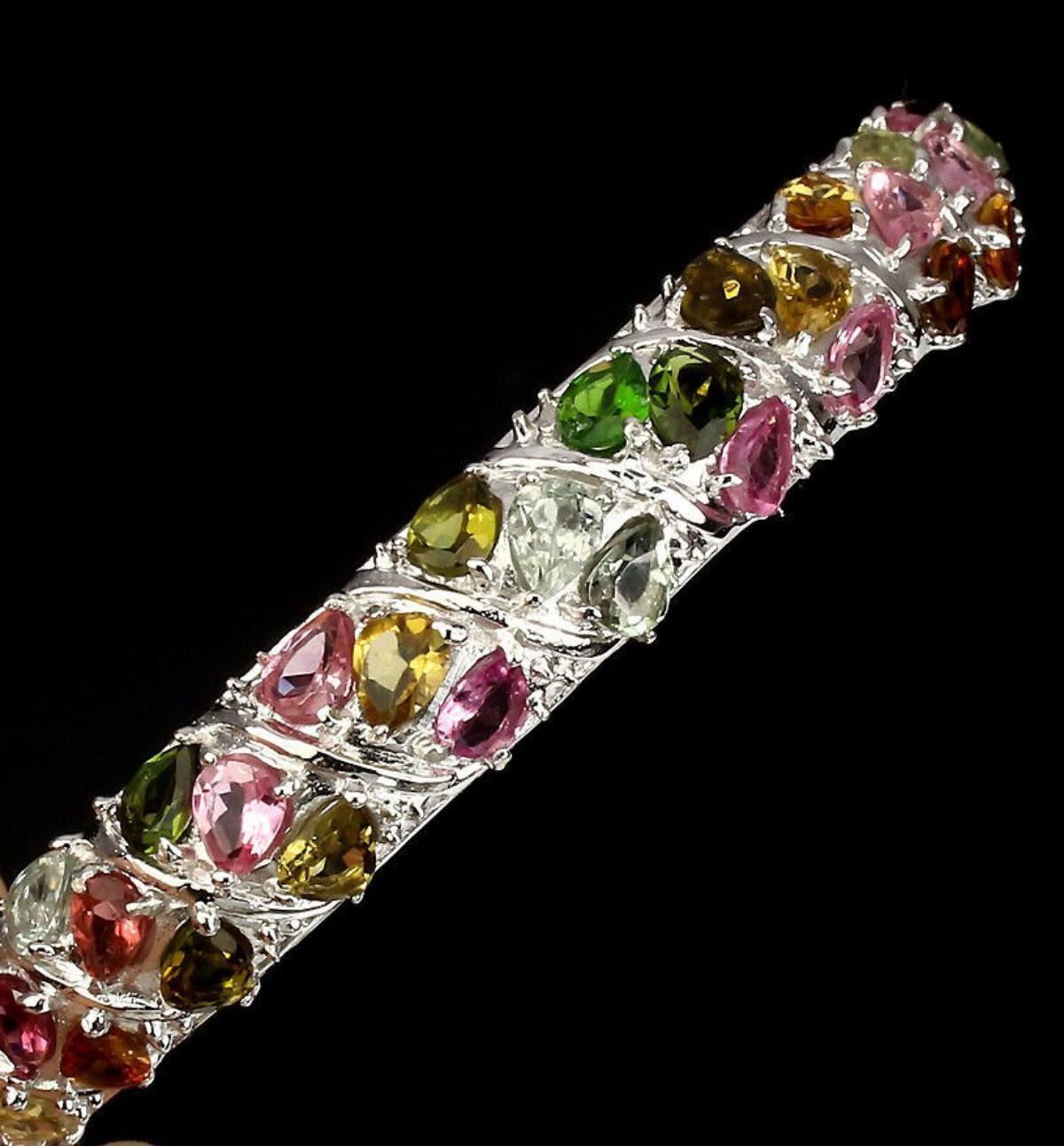925 STERLING SILVER;PLATE...14K WHITE GOLD;MAIN STONETOURMALINE;TOTAL WEIGHT129.66 CT (TOTAL WEIGHT OF SILVER + STONE)DIMENSION* STONE 5.0 X 3.0 MM. * DIAMETER 2.3 INCHES. * FACE BANGLE 68.0 X 10.0 MM.;MAIN STONE SHAPEPEAR CUT;MAIN STONE COLORTOP FANCY COLORS;CLARITY/GRADEIF TO VVS;LUSTERMESMERIZING;TREATMENTUNHEATED;ORIGINBRAZIL;HARDNESS7.0 - 7.5;