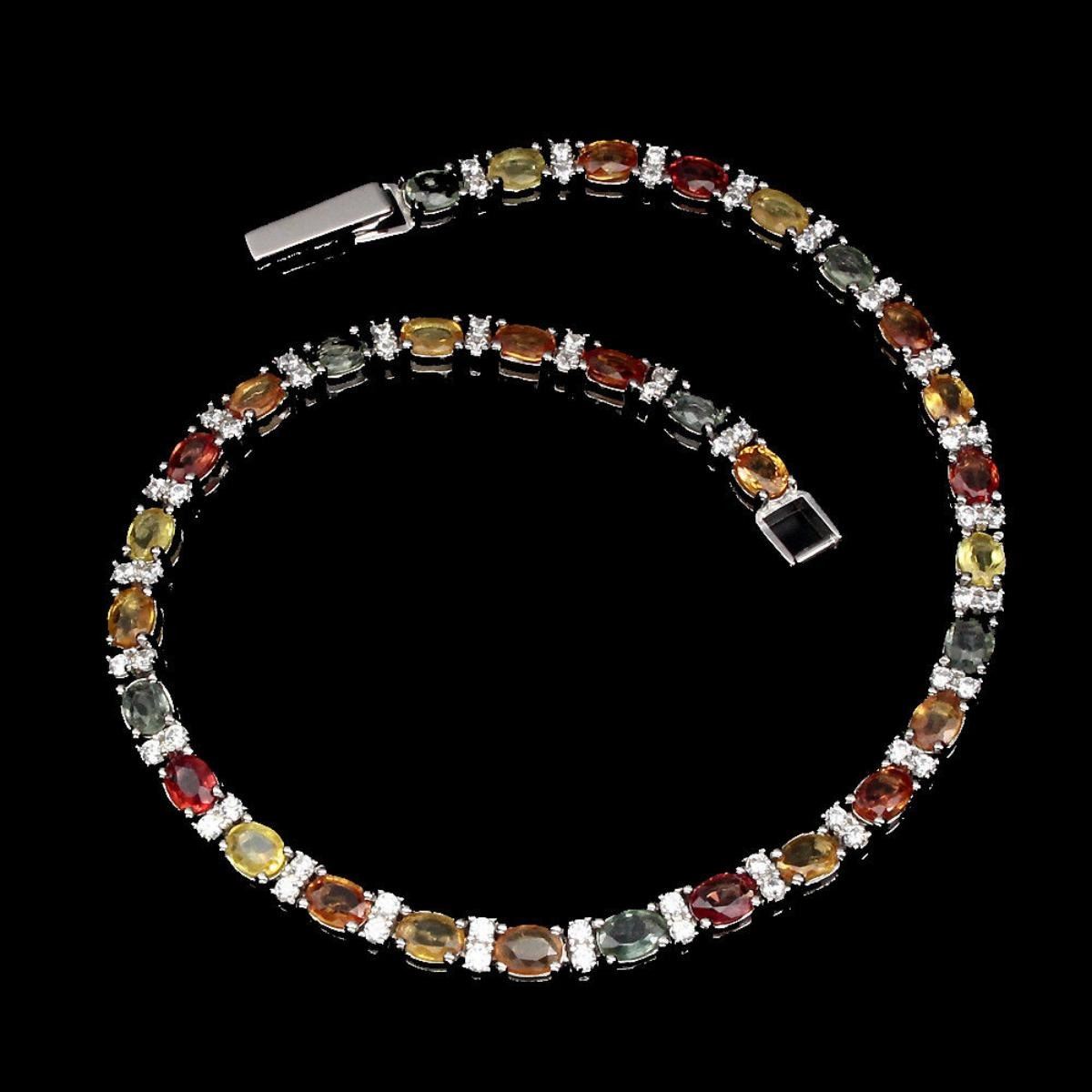 925 STERLING SILVER;PLATE....14K WHITE GOLD;LENGTH (INCHES)7.5;MAIN STONE...SAPPHIRE...OTHER GEMSCUBIC ZIRCONIATOTAL WEIGHT46.53 CT (TOTAL WEIGHT OF SILVER + STONE)DIMENSION* STONE 4.0 X 3.0 MM. * CZ 1.5 MM. * FACE BRACELET 185.0 X 3.0 MM.MAIN STONE SHAPEOVAL CUTMAIN STONE COLORTOP FANCY COLORSCLARITY/GRADEIF TO VVSLUSTERBEWITCHINGTREATMENTHEATEDORIGINSONGEA - AFRICAHARDNESS9.0