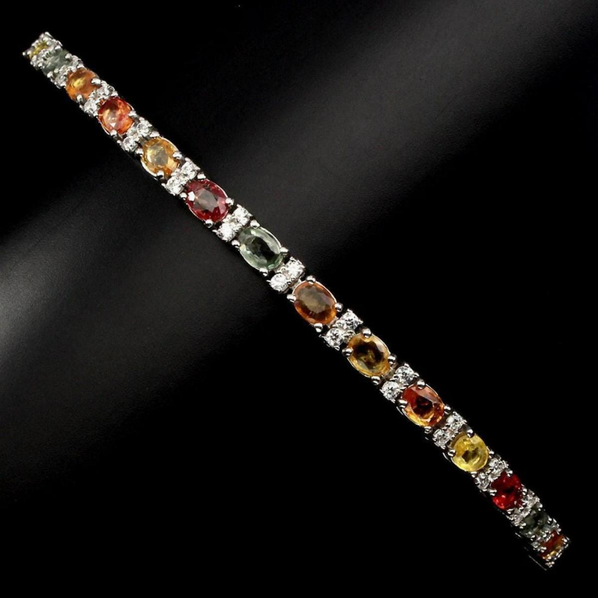 925 STERLING SILVER;PLATE....14K WHITE GOLD;LENGTH (INCHES)7.5;MAIN STONE...SAPPHIRE...OTHER GEMSCUBIC ZIRCONIATOTAL WEIGHT46.53 CT (TOTAL WEIGHT OF SILVER + STONE)DIMENSION* STONE 4.0 X 3.0 MM. * CZ 1.5 MM. * FACE BRACELET 185.0 X 3.0 MM.MAIN STONE SHAPEOVAL CUTMAIN STONE COLORTOP FANCY COLORSCLARITY/GRADEIF TO VVSLUSTERBEWITCHINGTREATMENTHEATEDORIGINSONGEA - AFRICAHARDNESS9.0
