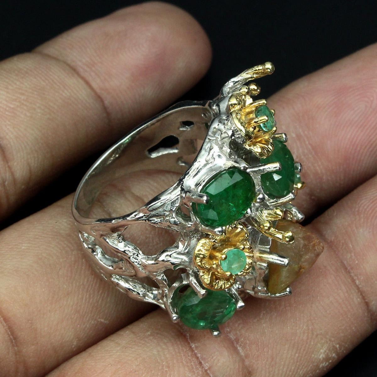 925 STERLING SILVER;PLATE2-TONE WHITE & YELLOW 14K GOLD;RING SIZE9(resizeable)MAIN STONEEMERALDOTHER GEMSSAPPHIRETOTAL WEIGHT81.64 CT (TOTAL WEIGHT OF SILVER + STONE)DIMENSION* STONE 3.0 TO 11.0 X 8.0 MM. * FACE RING 28.0 X 25.0 MM.MAIN STONE SHAPEOVAL CUTMAIN STONE COLORTOP RICH GREENCLARITY/GRADETRANSPARENTLUSTERMESMERIZINGTREATMENTUNHEATEDORIGINBRAZILHARDNESS7.5 - 9.0