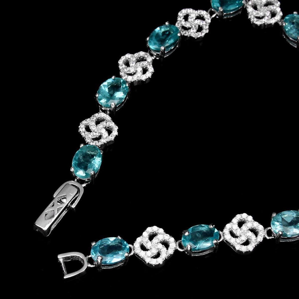 925 STERLING SILVER;PLATE14K WHITE GOLD;LENGTH (INCHES)8.5;;MAIN STONEAPATITE;OTHER GEMSCUBIC ZIRCONIA;TOTAL WEIGHT57.62 CT (TOTAL WEIGHT OF SILVER + STONE)DIMENSION;* STONE 7.0 X 5.0 MM. * CZ 1.0 MM. * FACE BRACELET 181.0 X 7.0 MM.;MAIN STONE SHAPEOVAL CUT;MAIN STONE COLORTOP NEON BLUE;CLARITY/GRADEIF TO VVS;LUSTERPRECIOUS;ORIGINBrazil;HARDNESS5;