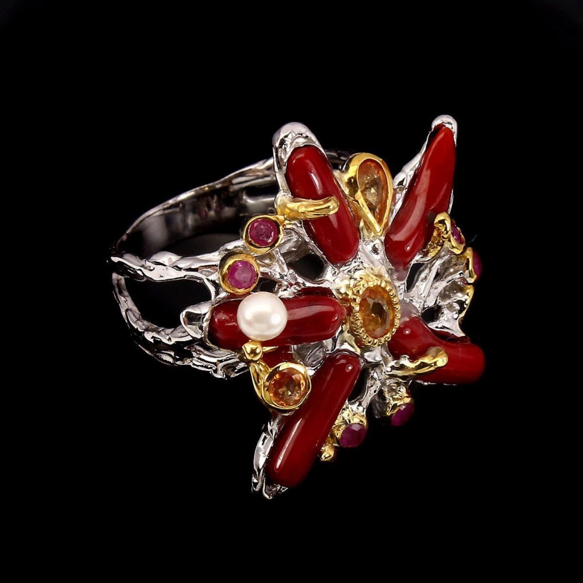925 STERLING SILVER;PLATE2-TONE WHITE & YELLOW 14K GOLD;RING SIZE8.5 (resizeable)...MAIN STONECORALOTHER GEMSPEARL,RUBY,SAPPHIRETOTAL WEIGHT48.88 CT (TOTAL WEIGHT OF SILVER + STONE)DIMENSION* STONE 2.0 TO 10.0 X 3.0 MM. * PEARL 3.0 MM. * RING SIZE 8.5 * FACE RING 26.0 MM.MAIN STONE SHAPEROUGH NATURALMAIN STONE COLORTOP REDCLARITY/GRADEOPAQUELUSTERGORGEOUSTREATMENTUNHEATEDORIGINCROATIAHARDNESS2.5 - 9.0