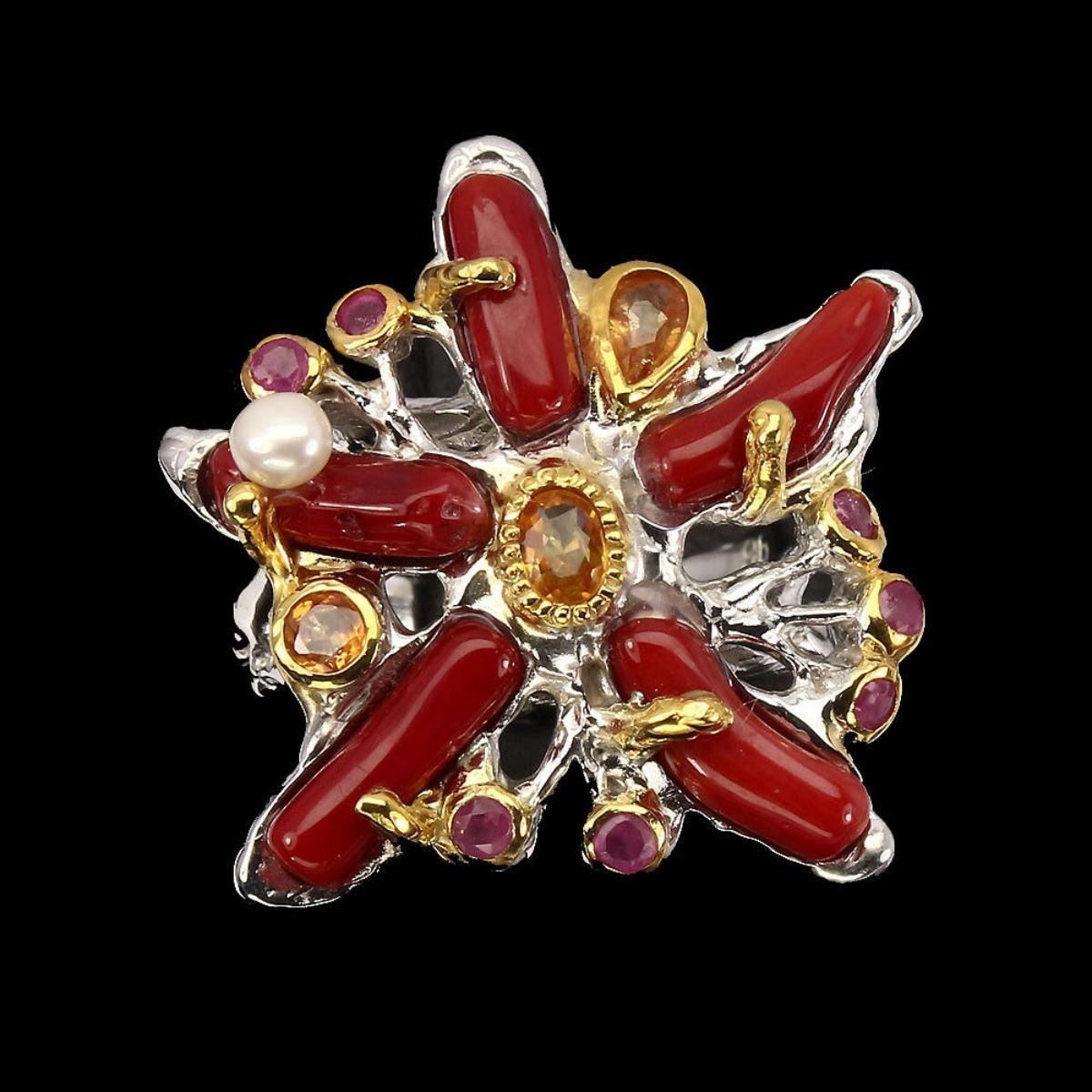 925 STERLING SILVER;PLATE2-TONE WHITE & YELLOW 14K GOLD;RING SIZE8.5 (resizeable)...MAIN STONECORALOTHER GEMSPEARL,RUBY,SAPPHIRETOTAL WEIGHT48.88 CT (TOTAL WEIGHT OF SILVER + STONE)DIMENSION* STONE 2.0 TO 10.0 X 3.0 MM. * PEARL 3.0 MM. * RING SIZE 8.5 * FACE RING 26.0 MM.MAIN STONE SHAPEROUGH NATURALMAIN STONE COLORTOP REDCLARITY/GRADEOPAQUELUSTERGORGEOUSTREATMENTUNHEATEDORIGINCROATIAHARDNESS2.5 - 9.0