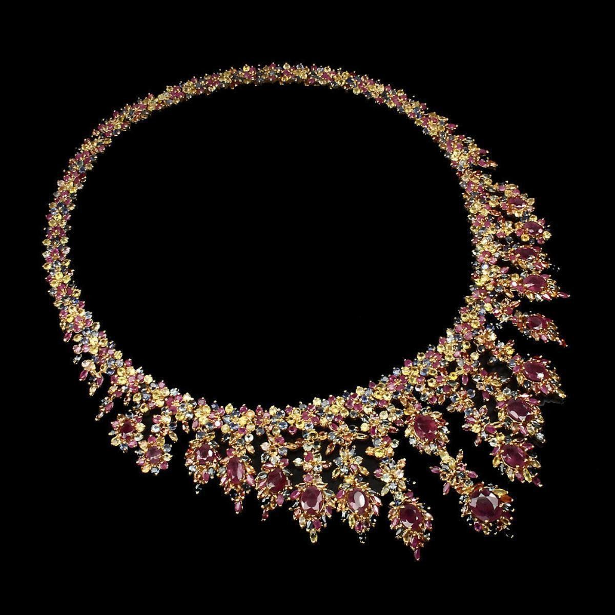 925 STERLING SILVER;PLATE 14K YELLOW GOLD; LENGTH (INCHES)18;MAIN STONE RUBY;OTHER GEMS SAPPHIRE;TOTAL WEIGHT 728.90 CT (TOTAL WEIGHT OF SILVER + STONE)DIMENSION* STONE 2.5 TO 10.0 X 8.0 MM. * STONES PART LENGTH 465.0 X 63.0 MM.;MAIN STONE SHAPE-OVAL CUT;MAIN STONE COLOR-TOP RICH RED PINK;CLARITY/GRADE-TRANSPARENT;LUSTER-WONDERFUL; ORIGIN-MOZAMBIQUE; HARDNESS-9;