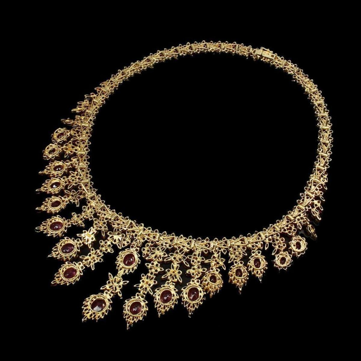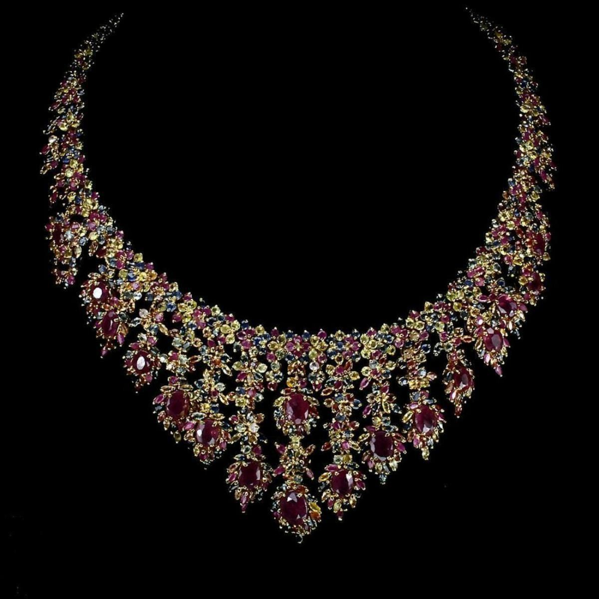925 STERLING SILVER;PLATE 14K YELLOW GOLD; LENGTH (INCHES)18;MAIN STONE RUBY;OTHER GEMS SAPPHIRE;TOTAL WEIGHT 728.90 CT (TOTAL WEIGHT OF SILVER + STONE)DIMENSION* STONE 2.5 TO 10.0 X 8.0 MM. * STONES PART LENGTH 465.0 X 63.0 MM.;MAIN STONE SHAPE-OVAL CUT;MAIN STONE COLOR-TOP RICH RED PINK;CLARITY/GRADE-TRANSPARENT;LUSTER-WONDERFUL; ORIGIN-MOZAMBIQUE; HARDNESS-9;
