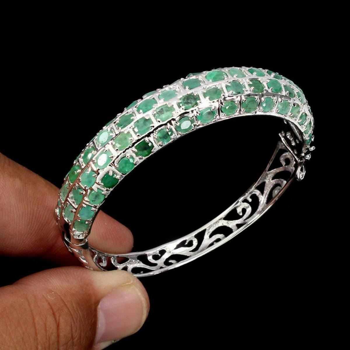 925 STERLING SILVER;PLATE14K WHITE GOLD;LENGTH (INCHES)2MAIN STONEEMERALDTOTAL WEIGHT113.45 CT (TOTAL WEIGHT OF SILVER + STONE)DIMENSION* STONE 4.0 X 3.0 MM. * DIAMETER 2.0 INCHES. * FACE BANGLE 64.0 X 12.0 MM.MAIN STONE SHAPEOVAL CUTMAIN STONE COLORTOP RICH GREENCLARITY/GRADETRANSPARENTLUSTERSUMPTUOUSTREATMENTUNHEATEDORIGINBRAZILHARDNESS7.5 - 8.0