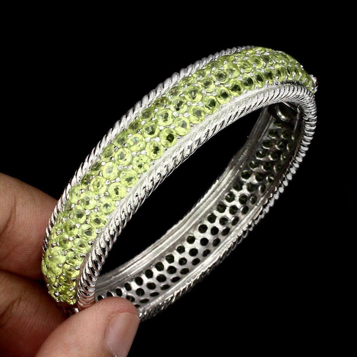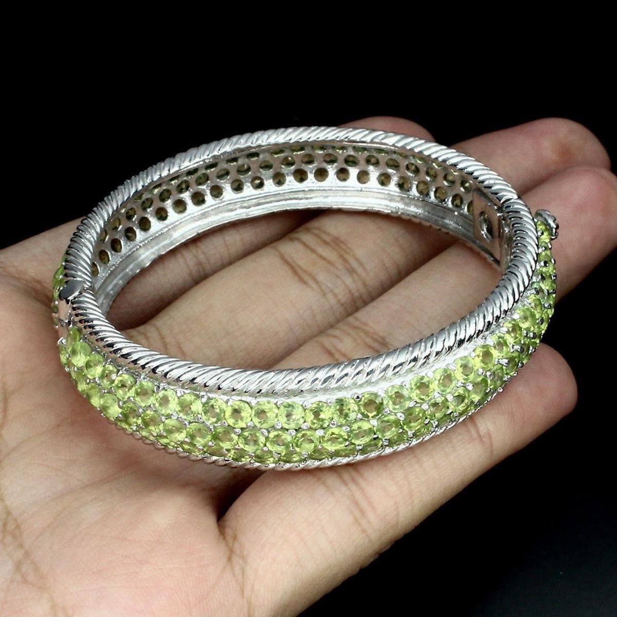 925 STERLING SILVER;PLATE...14K WHITE GOLD;MAIN STONEPERIDOTOTHER GEMSTOTAL WEIGHT169.50 CT (TOTAL WEIGHT OF SILVER + STONE)DIMENSION* STONE 3.0 MM. * DIAMETER 2.0 INCHES. * FACE BANGLE 63.0 X 10.0 MM.MAIN STONE SHAPEROUND CUTMAIN STONE COLORTOP RICH GREENCLARITY/GRADEIF TO VVSLUSTERMESMERIZINGTREATMENTUNHEATEDORIGINPAKISTANHARDNESS6.5 - 7.0