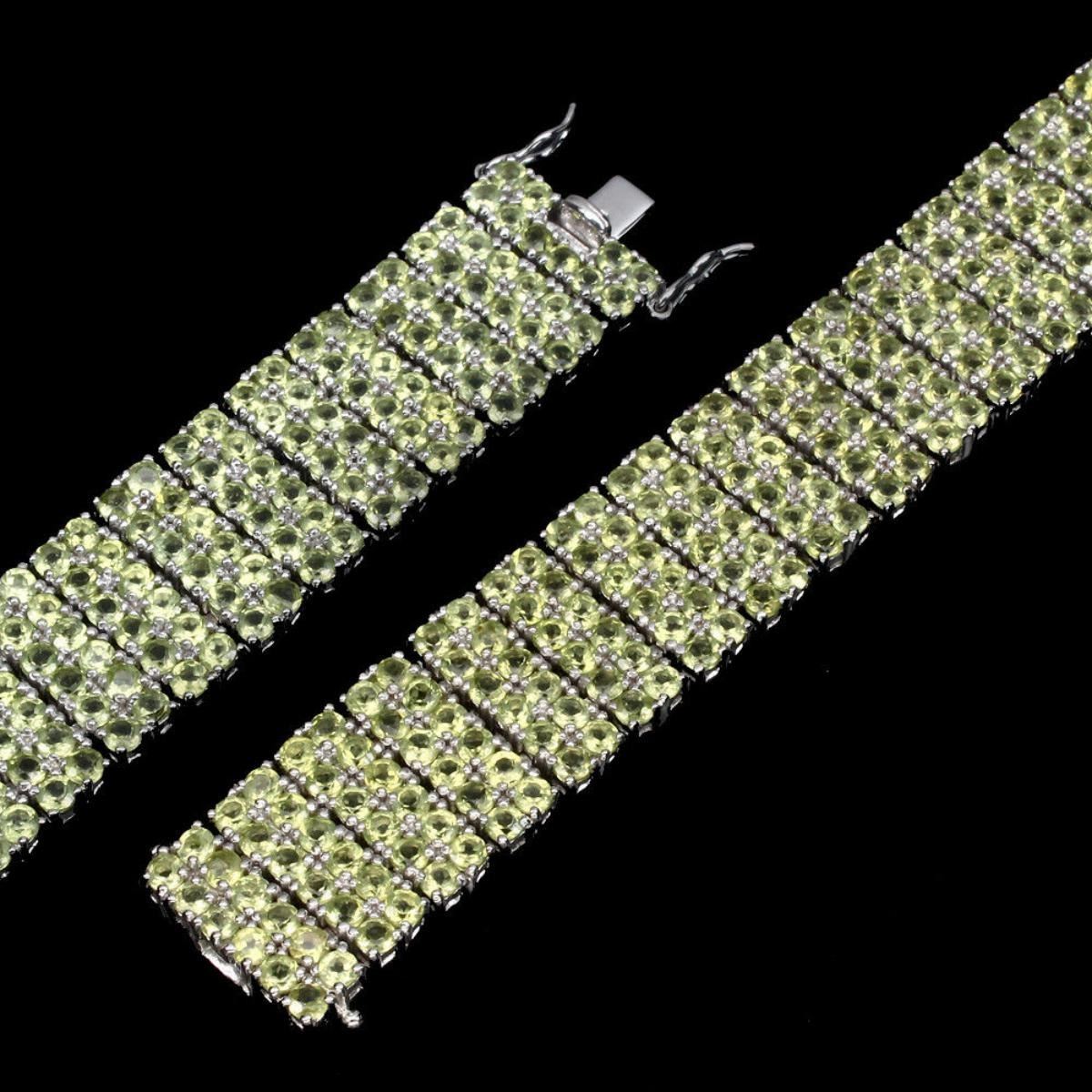 925 STERLING SILVER;PLATE.....14K WHITE GOLD;LENGTH (INCHES)7MAIN STONE-PERIDOT;TOTAL WEIGHT287.43 CT (TOTAL WEIGHT OF SILVER + STONE)DIMENSION* STONE 3.0 MM. * FACE BRACELET 180.0 X 19.0 MM.MAIN STONE SHAPE-ROUND CUT;MAIN STONE COLOR-TOP RICH GREEN;CLARITY/GRADE-IF TO VVS;LUSTER-PRECIOUS;TREATMENT-UNHEATED;ORIGIN-PAKISTAN;HARDNESS-6.5 - 7.0;