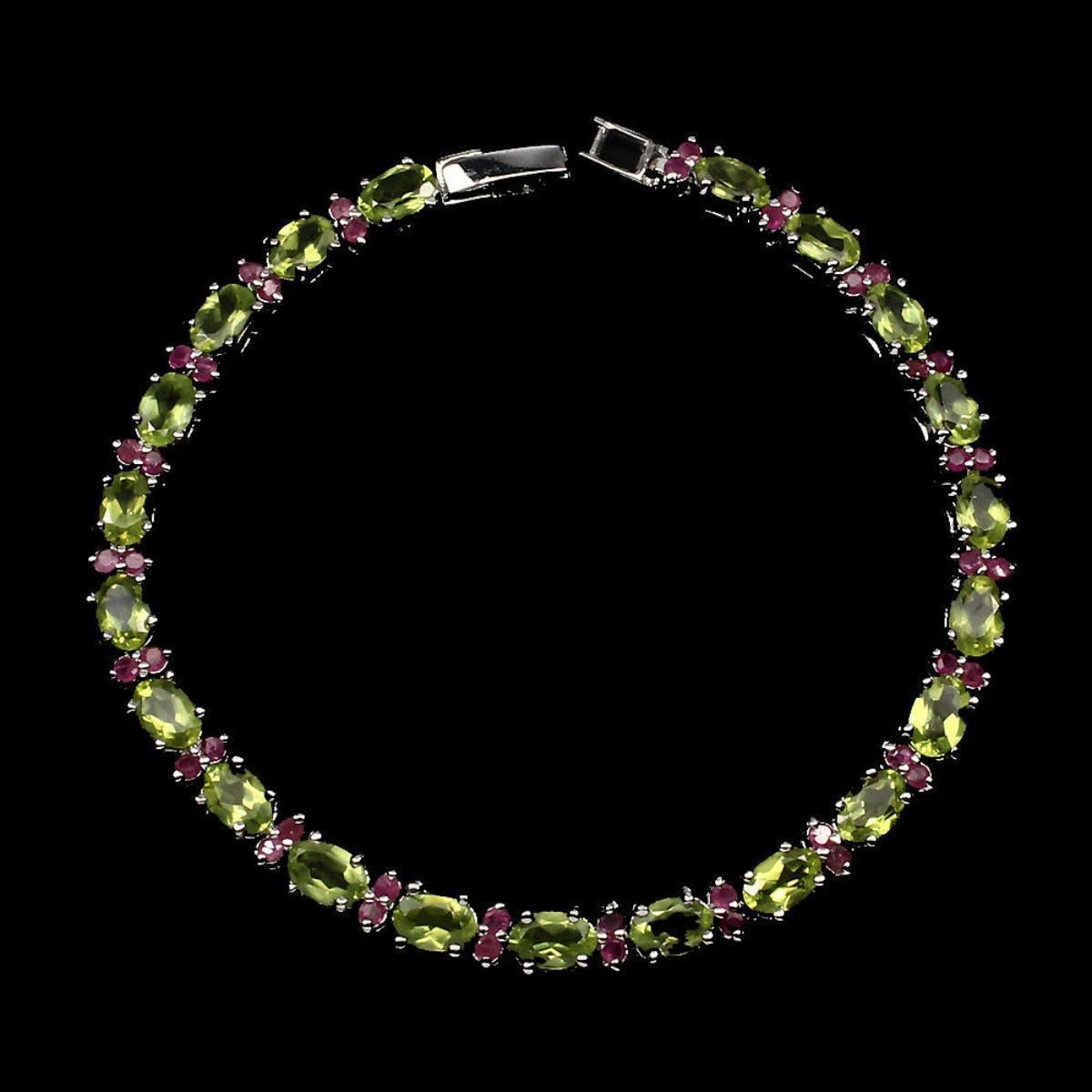 925 STERLING SILVER;PLATE14K WHITE GOLD;LENGTH (INCHES)7.5;;MAIN STONEPERIDOT;OTHER GEMSRUBY;TOTAL WEIGHT63.32 CT (TOTAL WEIGHT OF SILVER + STONE)DIMENSION* STONE 2.0 TO 6.0 X 4.0 MM. * FACE BRACELET 184.0 X 5.0 MM.MAIN STONE SHAPEOVAL CUT;MAIN STONE COLORTOP RICH GREEN;CLARITY/GRADEIF TO VVS;LUSTERGORGEOUS;TREATMENTUNHEATED;ORIGINPAKISTAN;HARDNESS6.5 - 9.0;