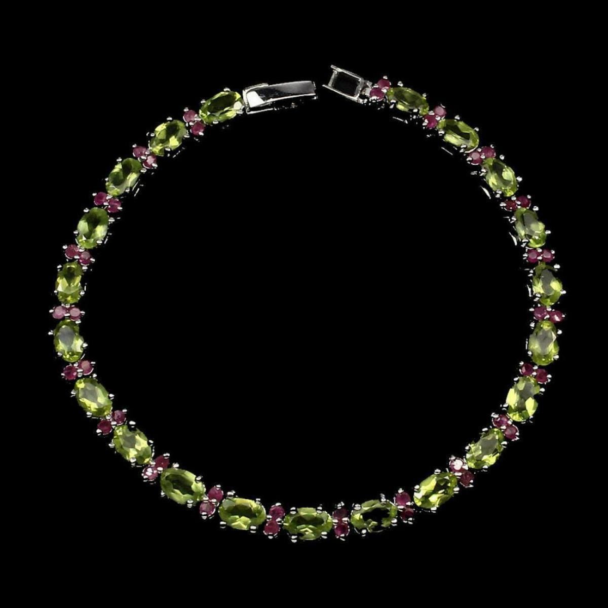 925 STERLING SILVER;PLATE 14K WHITE GOLD;LENGTH (INCHES)7.5;;MAIN STONE PERIDOT;OTHER GEMS RUBY;TOTAL WEIGHT63.32 CT (TOTAL WEIGHT OF SILVER + STONE)DIMENSION* STONE 2.0 TO 6.0 X 4.0 MM. * FACE BRACELET 184.0 X 5.0 MM.MAIN STONE SHAPEOVAL CUT;MAIN STONE COLORTOP RICH GREEN;CLARITY/GRADEIF TO VVS;;TREATMENT UNHEATED;ORIGIN PAKISTAN;HARDNESS 6.5 - 9.0;