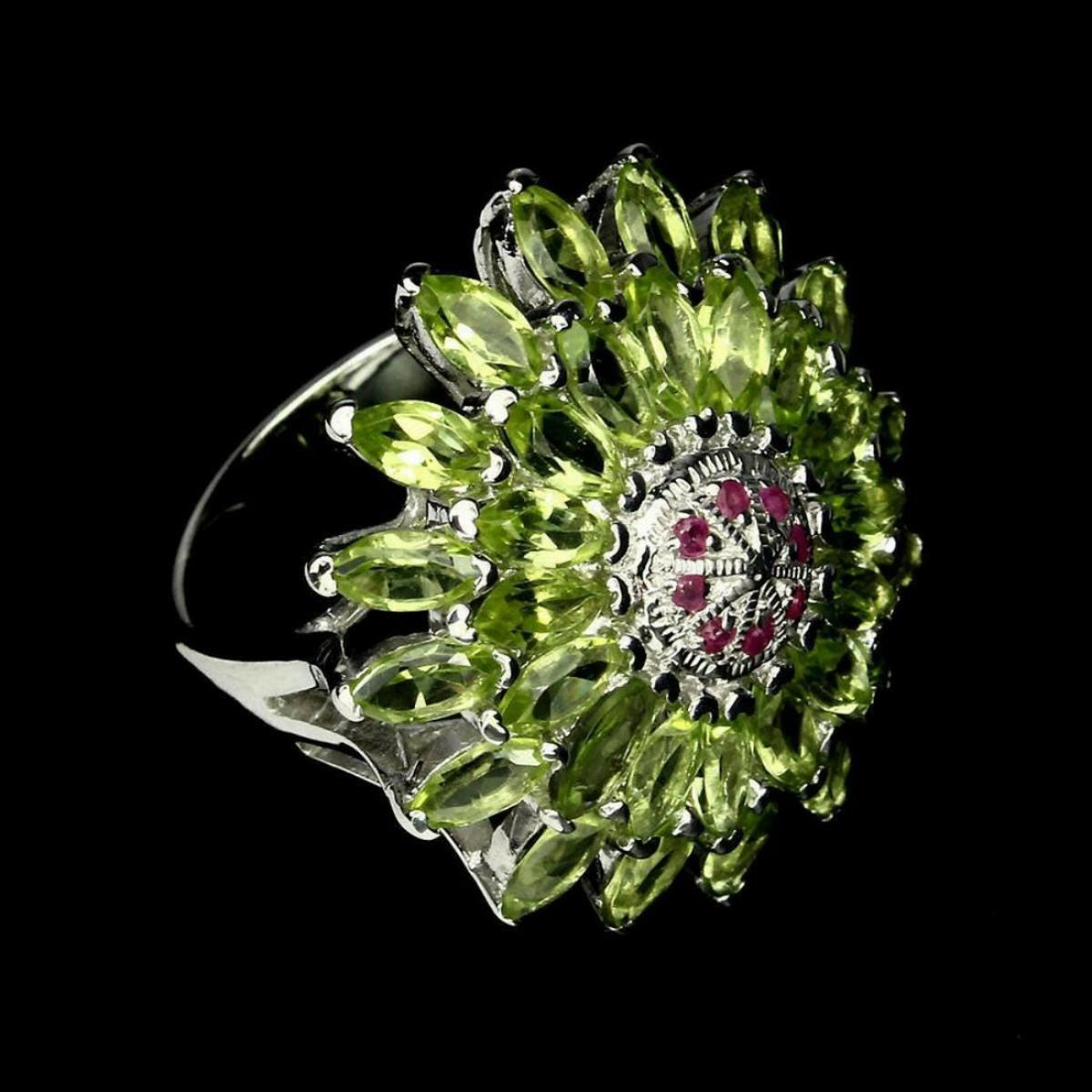 Main Stone:PeridotMetal:925 sterling silverMain Stone Shape:Marquise CutBase Metal:Fine Silver, 925 parts per 1000Main Stone Color:Top Rich GreenStyle:Solitaire with Accents;Main Stone Treatment:Unheated;Metal Purity:925 parts per 1000;Secondary Stone:RubyRing Size:9(resizeable);Luster:GorgeousPlate:14k White GoldTreatment:Unheated;Origin:Pakistan;Hardness:6.5 - 9.0
