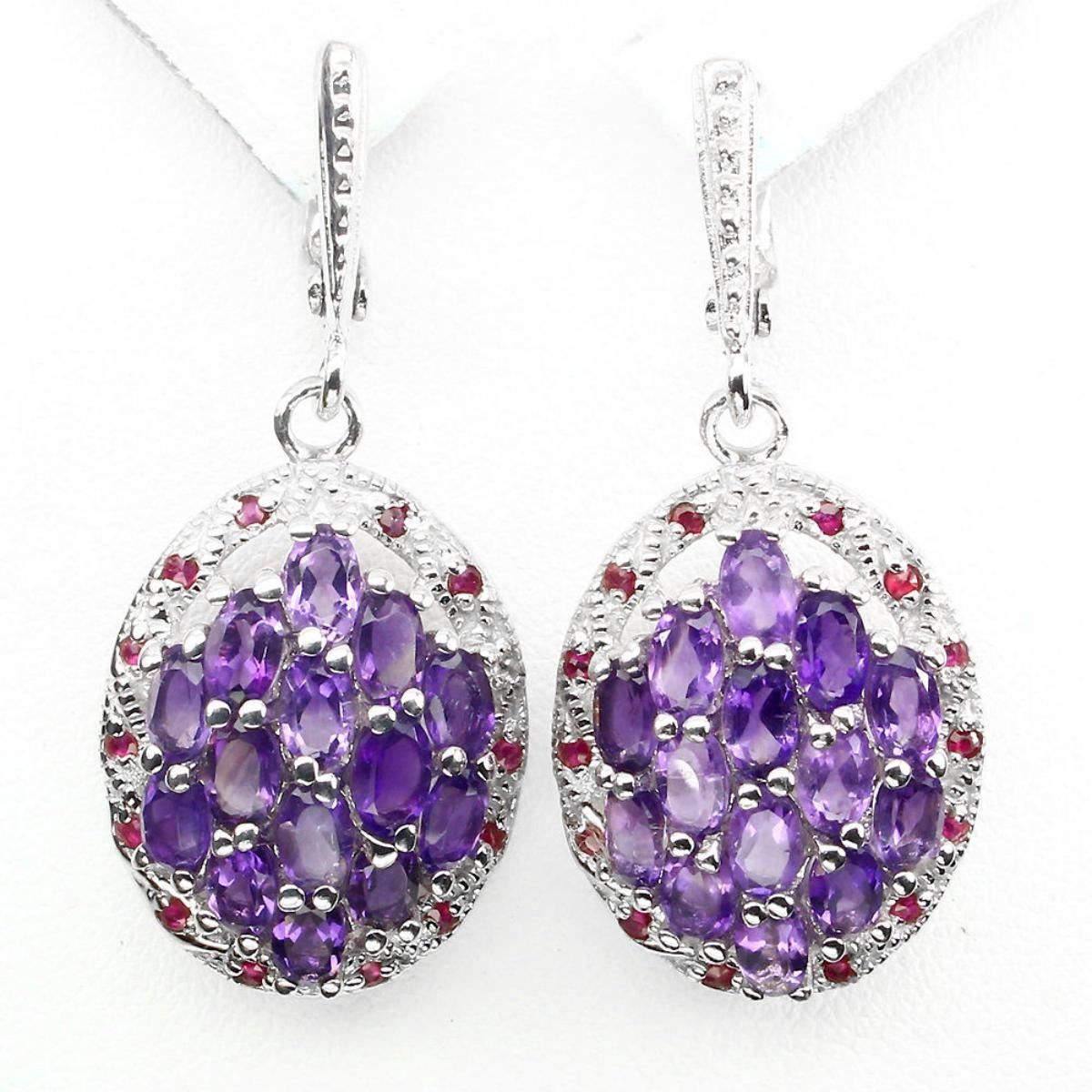925 STERLING SILVER.......PLATE-14K WHITE GOLD.MAIN STONE-AMETHYST;OTHER GEMS-RUBY;TOTAL WEIGHT-53.01 CT (TOTAL WEIGHT OF SILVER + STONE)DIMENSION* STONE 1.0 TO 5.0 X 3.0 MM. * FACE EARRINGS 40.0 X 18.0 MM.;MAIN STONE SHAPE-OVAL CUT;MAIN STONE COLOR-TOP RICH PURPLE;CLARITY/GRADE-IF TO VVS;LUSTER-GORGEOUS;TREATMENT-UNHEATED;ORIGIN-URUGURY;HARDNESS-7.0 - 9.0