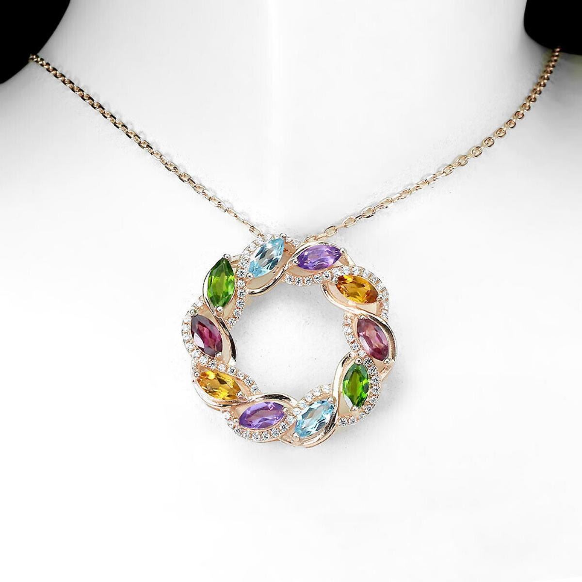 925 STERLING SILVER;PLATE-14K ROSE GOLD;LENGTH (INCHES)16.5;MAIN STONE-SKY BLUE TOPAZ;OTHER GEMS-AMETHYST, CHROME DIOPSIDE, CITRINE, RHODOLITE GARNET;TOTAL WEIGHT-6.45 GRAM (TOTAL WEIGHT OF SILVER + STONE)DIMENSION-* STONE 6.0 X 3.0 MM.;* TOTAL LENGTH -16.5 INCHES.;* STONES PART LENGTH- 26.0 X 26.0 MM.;MAIN STONE SHAPE-MARQUISE CUT;MAIN STONE COLOR- SKY BLUE;CLARITY/GRADE-IF TO VVS;TREATMENT-IRRADIATED & Natural;ORIGIN-AFRICA;HARDNESS-8.0;