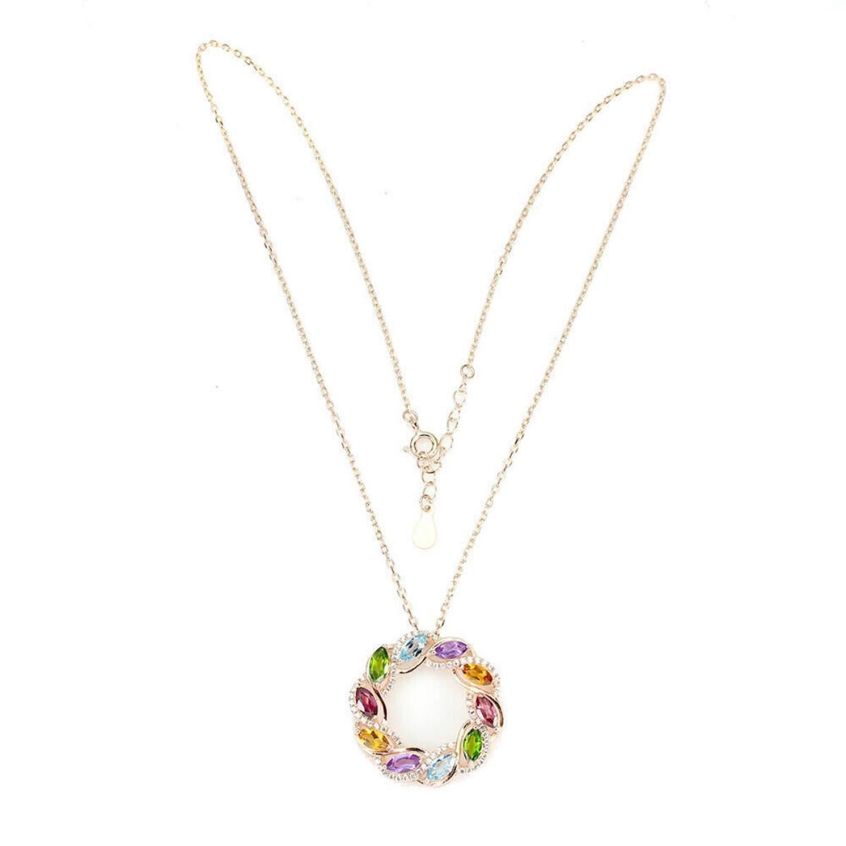 925 STERLING SILVER;PLATE-14K ROSE GOLD;LENGTH (INCHES)16.5;MAIN STONE-SKY BLUE TOPAZ;OTHER GEMS-AMETHYST, CHROME DIOPSIDE, CITRINE, RHODOLITE GARNET;TOTAL WEIGHT-6.45 GRAM (TOTAL WEIGHT OF SILVER + STONE)DIMENSION-* STONE 6.0 X 3.0 MM.;* TOTAL LENGTH -16.5 INCHES.;* STONES PART LENGTH- 26.0 X 26.0 MM.;MAIN STONE SHAPE-MARQUISE CUT;MAIN STONE COLOR- SKY BLUE;CLARITY/GRADE-IF TO VVS;TREATMENT-IRRADIATED & Natural;ORIGIN-AFRICA;HARDNESS-8.0;