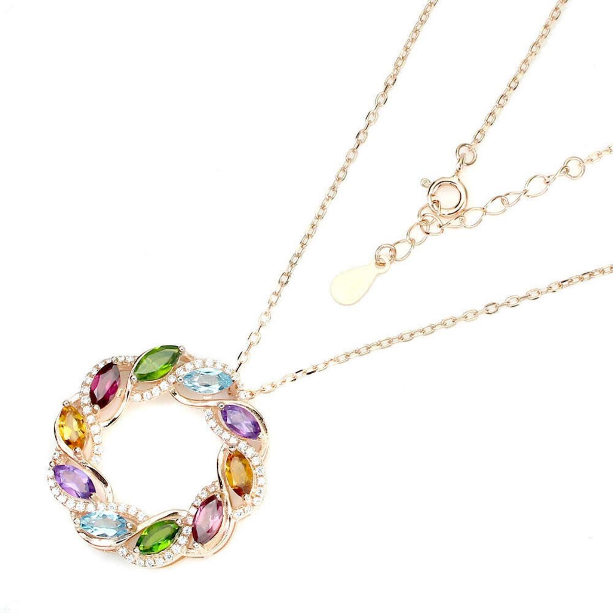 925 STERLING SILVER;PLATE-14K ROSE GOLD;LENGTH (INCHES)16.5;MAIN STONE-SKY BLUE TOPAZ;OTHER GEMS-AMETHYST, CHROME DIOPSIDE, CITRINE, RHODOLITE GARNET;TOTAL WEIGHT-6.45 GRAM (TOTAL WEIGHT OF SILVER + STONE)DIMENSION-* STONE 6.0 X 3.0 MM.;* TOTAL LENGTH -16.5 INCHES.;* STONES PART LENGTH- 26.0 X 26.0 MM.;MAIN STONE SHAPE-MARQUISE CUT;MAIN STONE COLOR- SKY BLUE;CLARITY/GRADE-IF TO VVS;TREATMENT-IRRADIATED & Natural;ORIGIN-AFRICA;HARDNESS-8.0;