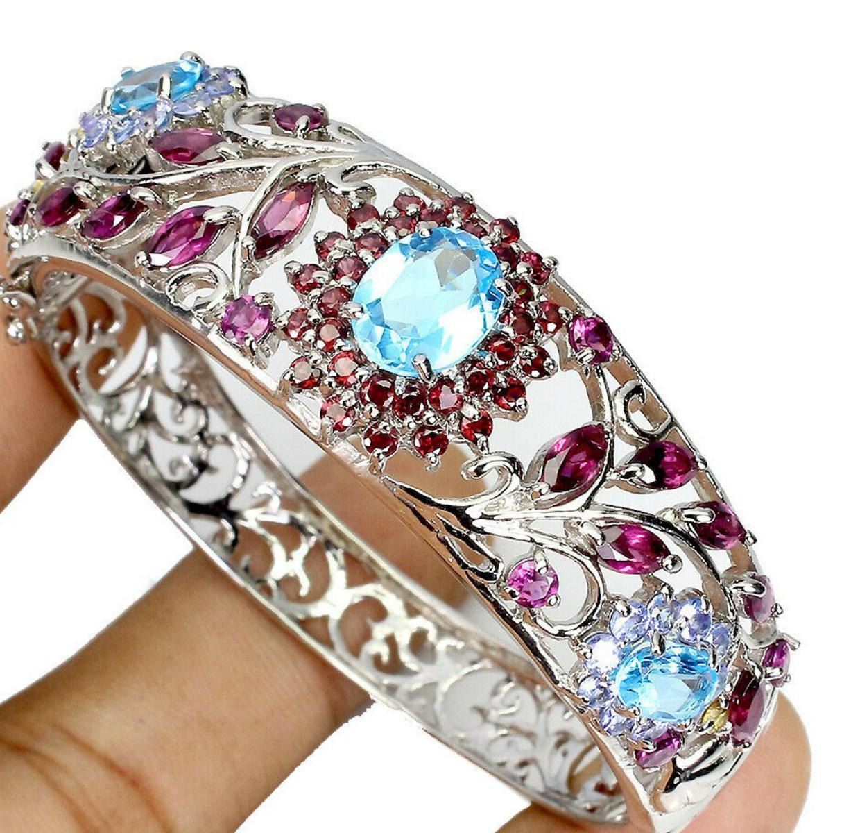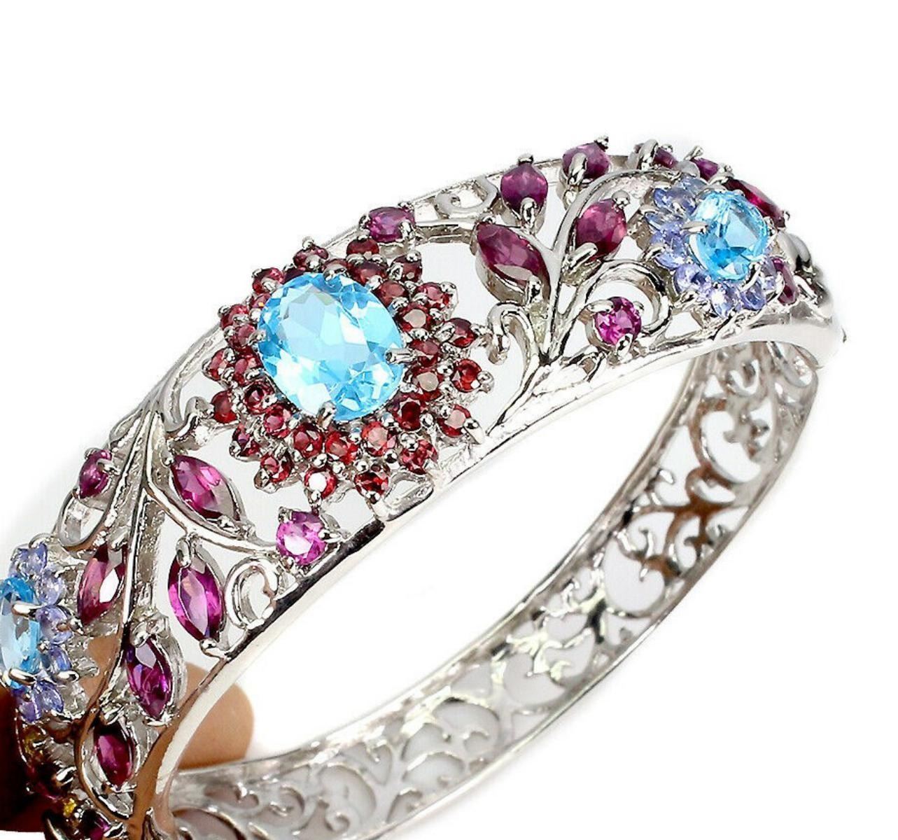 925 STERLING SILVER;PLATE-14K WHITE GOLD;MAIN STONE-BLUE TOPAZ;OTHER GEMS-RHODOLITE GARNET, SAPPHIRE, TANZANITE;TOTAL WEIGHT-31.83 GRAM (TOTAL WEIGHT OF SILVER + STONE)DIMENSION-* STONE 2.0 TO 10.0 X 8.0 MM. * DIAMETER 2.2 X 2.2 INCHES. * FACE BANGLE 62.0 X 18.0 MM.;MAIN STONE SHAPE-OVAL CUT;MAIN STONE COLOR-SWISS BLUE;CLARITY/GRADE-IF;ORIGIN-AFRICA;HARDNESS-8;