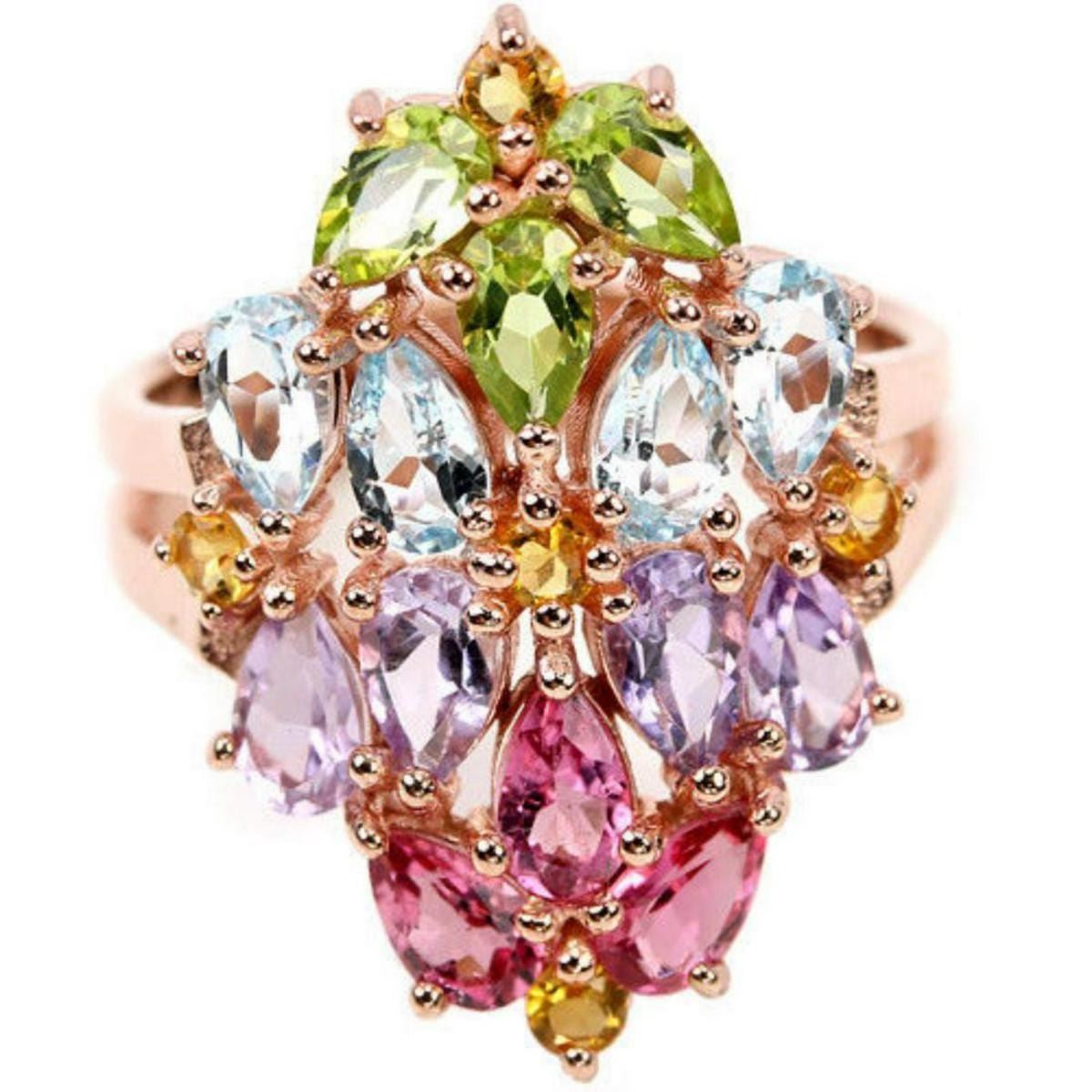 SKY TOPAZ PERIDOT CITRINE & TOURMALINE 925SILVER RING 14K PINK GOLD COATING; RING SIZE 7.00 ( can be resized )ITEM QUANTITY1STONE SHAPEPEAR & ROUND PORTUGUESE CUTSTONE DIMENSION4 X 3 MM. , 2 MM.ITEM WEIGHT4.35 GRAMCOLORMULTI COLORCLARITYIF, VVS - SILUSTERELEGANTTREATMENTIRRADIATION & NATURAL UNHEATEDORIGIN OF STONEBRAZIL, AFRICA & ASIAHARDNESS6.5 - 8.0FACE OF RING 24 X 17 MM.