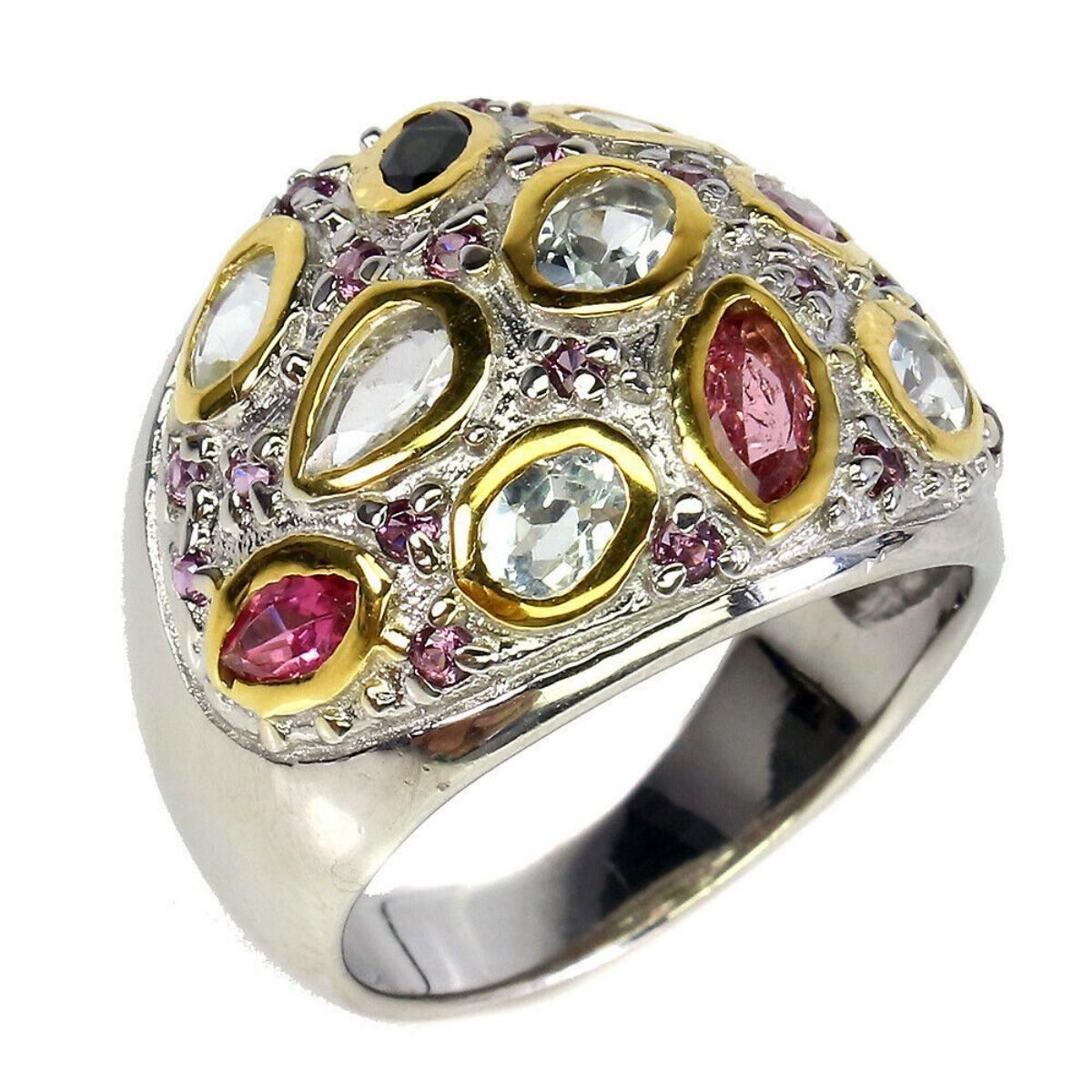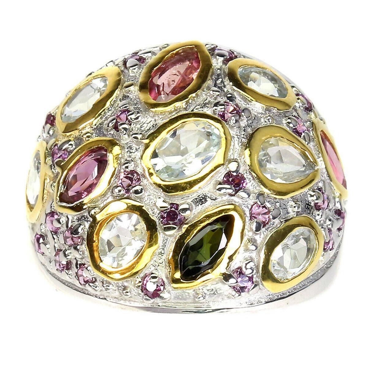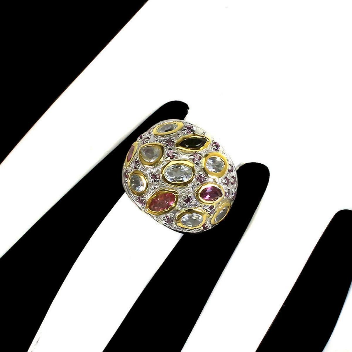 925 STERLING SILVER;PLATE2-TONE WHITE & YELLOW 14K GOLD;RING SIZE/resizeable-8;MAIN STONE-TOURMALINE;OTHER GEMS-AQUAMARINE, RHODOLITE GARNET;TOTAL WEIGHT-7.9 GRAM (TOTAL WEIGHT OF SILVER + STONE)DIMENSION-* STONE 1.5 TO 6.0 X 3.0 MM. * RING SIZE 8.0 * FACE RING -22.0 X 19.0 MM.;MAIN STONE SHAPE-MARQUISE CUT;MAIN STONE COLOR-MULTI-COLOR;CLARITY/GRADE-IF TO VVS;TREATMENT-UNHEATED;ORIGIN-BRAZIL;HARDNESS-7;