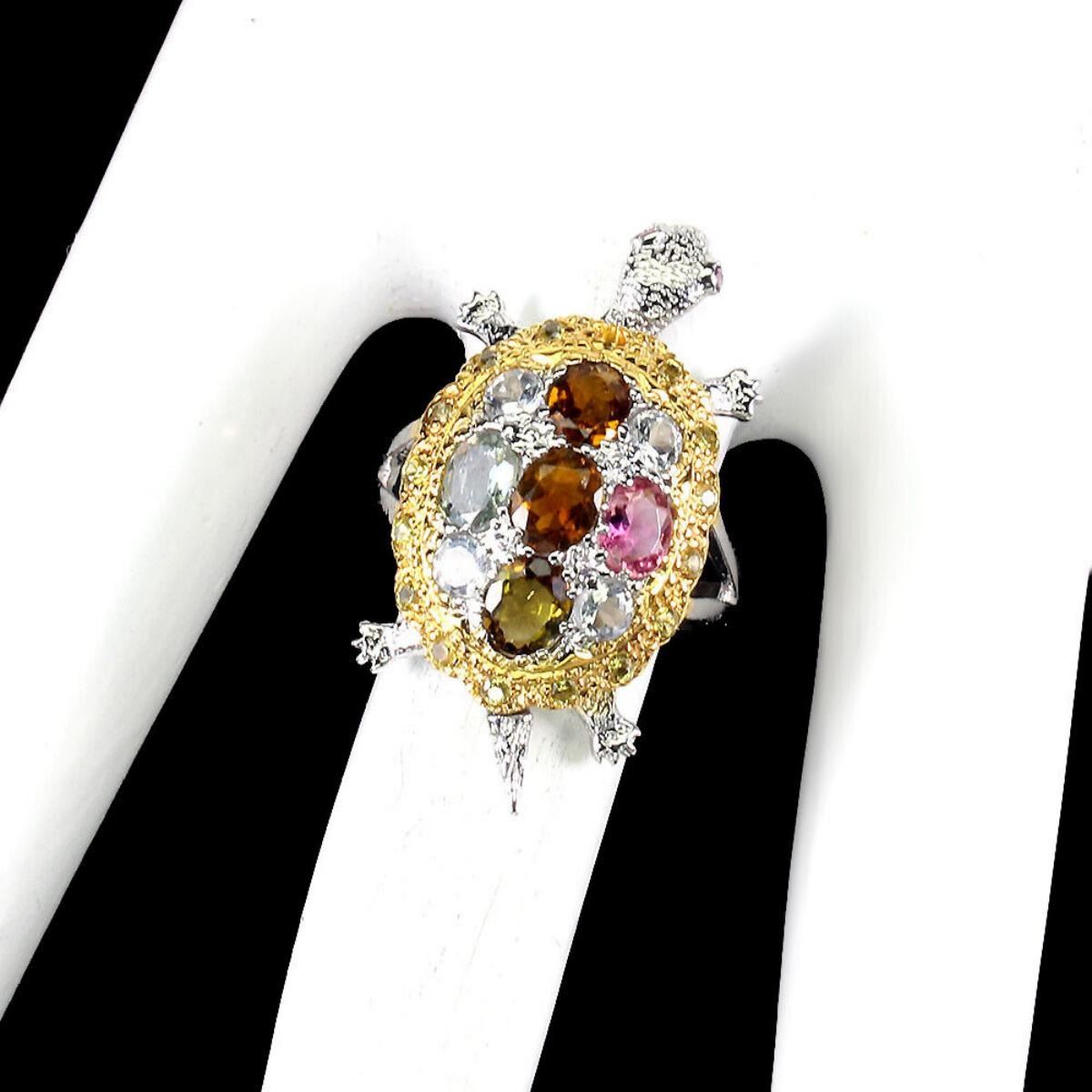 925 STERLING SILVER;PLATE2-TONE WHITE & YELLOW 14K GOLD;RING SIZE/resizable-8;MAIN STONE-TOURMALINEOTHER GEMS-AQUAMARINE, RHODOLITE GARNET, SAPPHIRETOTAL WEIGHT-5.22 GRAM (TOTAL WEIGHT OF SILVER + STONE)DIMENSION-* STONE 1.5 TO 5.0 X 4.0 MM.;* FACE RING- 32.0 X 15.0 MM.;MAIN STONE SHAPE-OVAL CUT;MAIN STONE COLOR-MULTI-COLOR;CLARITY/GRADE-IF TO VVS;-TREATMENT-UNHEATED;ORIGIN-BRAZIL;HARDNESS-7.0-7.5;