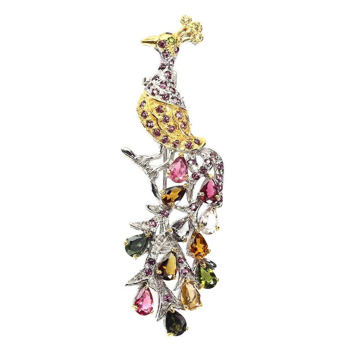 925 STERLING SILVER;PLATE-2-TONE WHITE & YELLOW 14K GOLD;MAIN STONE-TOURMALINE;OTHER GEMS-CHROME DIOPSIDE, RHODOLITE GARNET;TOTAL WEIGHT-8.97 GRAM (TOTAL WEIGHT OF SILVER + STONE)DIMENSION-* STONE 1.5 TO 6.0 X 4.0 MM. * FACE BROOCH 66.0 X 22.0 MM.;MAIN STONE SHAPE-PEAR CUT;MAIN STONE COLOR-MULTI-COLOR;CLARITY/GRADE-IF TO VVS;TREATMENT-UNHEATED;ORIGIN-BRAZIL;HARDNESS-7.0-7.5;