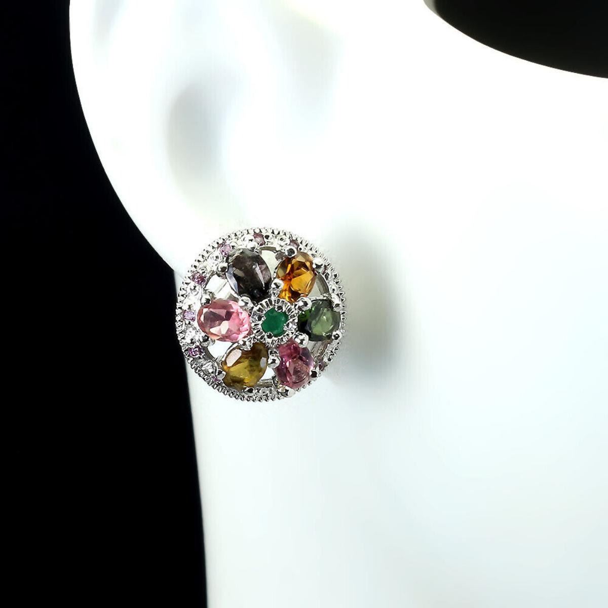 925 STERLING SILVER;PLATE-14K WHITE GOLD;MAIN STONE-TOURMALINE;OTHER GEMS-EMERALD, RHODOLITE GARNET;TOTAL WEIGHT-4.16 GRAM (TOTAL WEIGHT OF SILVER + STONE);DIMENSION-* STONE 1.0 TO 4.0 X 3.0 MM.* FACE EARRINGS 13.0 X 13.0 MM.;MAIN STONE SHAPE-OVAL ;MAIN STONE COLOR-MULTI-COLOR;CLARITY/GRADE-IF TO VVS;TREATMENT-UNHEATED;ORIGIN-BRAZIL;HARDNESS-7.0-7.5;