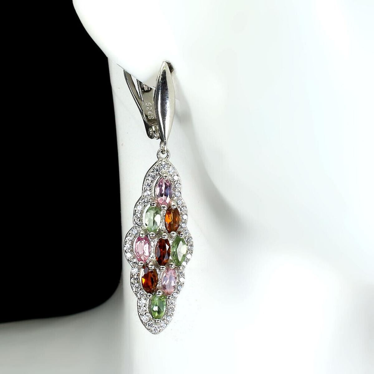 925 STERLING SILVER;PLATE-14K WHITE GOLD;MAIN STONE-TOURMALINE;TOTAL WEIGHT-7.97 GRAM (TOTAL WEIGHT OF SILVER + STONE);DIMENSION-* STONE 5.0 X 2.5 MM.* FACE EARRINGS 44.0 X 11.0 MM.;MAIN STONE SHAPE-MARQUISE ;MAIN STONE COLOR-MULTI-COLOR;CLARITY/GRADE-IF TO VVS;TREATMENT-UNHEATED;ORIGIN-BRAZIL;HARDNESS-7.0-7.5;