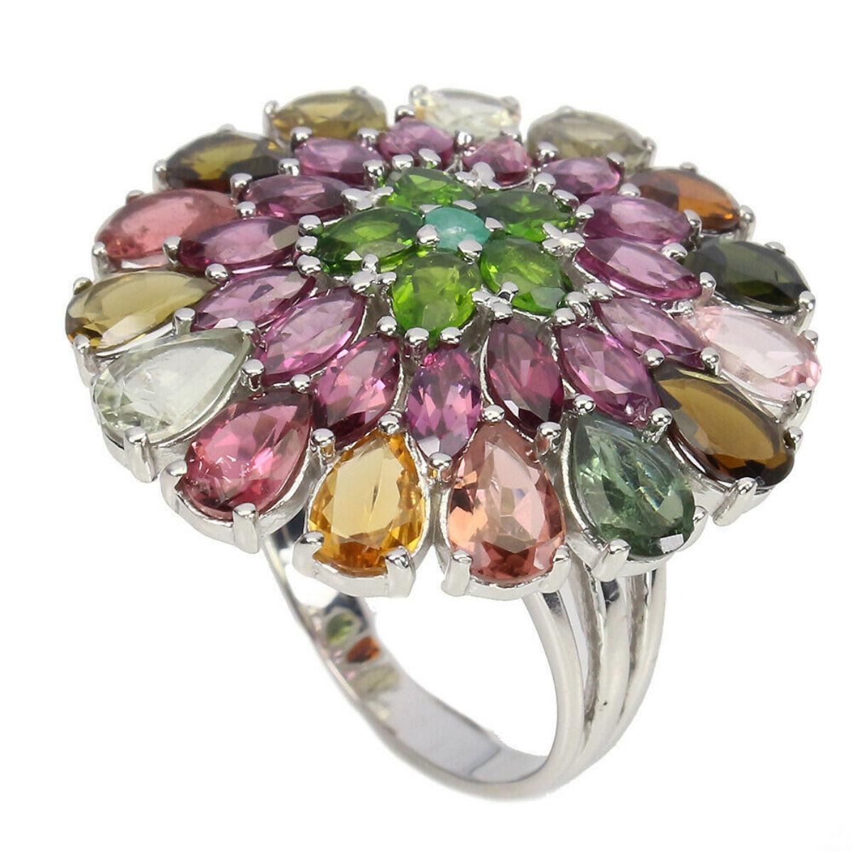 925 STERLING SILVER;PLATE-14K WHITE GOLD;RING SIZE-8(resizeable);MAIN STONE-TOURMALINE;OTHER GEMS-CHROME DIOPSIDE, EMERALD, RHODOLITE GARNET;TOTAL WEIGHT-9.69 GRAM (TOTAL WEIGHT OF SILVER + STONE)DIMENSION-* STONE 2.0 TO 6.0 X 4.0 MM. * RING SIZE 8.0 * FACE RING 27.0 X 27.0 MM.;MAIN STONE SHAPE-PEAR CUT;MAIN STONE COLOR-MULTI-COLOR;CLARITY/GRADE-IF TO VVS;LUSTER-PRECIOUS;TREATMENT-UNHEATED;ORIGIN-BRAZIL;HARDNESS-7.0-7.5;
