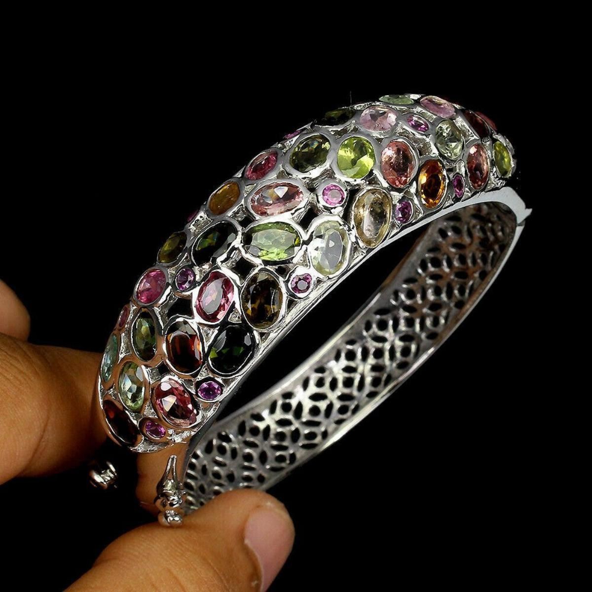 925 STERLING SILVER;PLATE-14K WHITE GOLD;MAIN STONE-TOURMALINE;OTHER GEMS-PERIDOT, RHODOLITE GARNET;TOTAL WEIGHT-38.99 GRAM (TOTAL WEIGHT OF SILVER + STONE)DIMENSION-* STONE 2.0 TO 6.0 X 4.0 MM. * DIAMETER 2.3 X 2.3 INCHES. * FACE BANGLE 61.0 X 18.0 MM.;MAIN STONE SHAPE-OVAL CUT;MAIN STONE COLOR-MULTI-COLOR;CLARITY/GRADE-IF TO VVS;-TREATMENT-UNHEATED;ORIGIN-BRAZIL;HARDNESS-7.0-7.5;