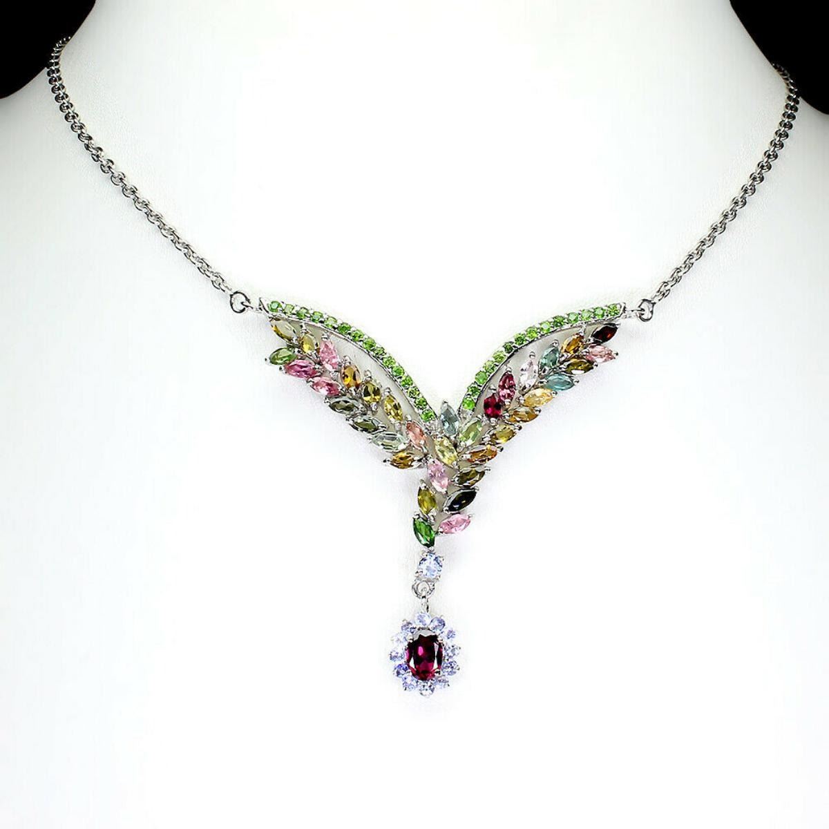 925 STERLING SILVER;PLATE-14K WHITE GOLD;LENGTH (INCHES)-19.5;MAIN STONE-TOURMALINE;OTHER GEMS-CHROME DIOPSIDE, RHODOLITE GARNET, TANZANITE;TOTAL WEIGHT-17.06 GRAM (TOTAL WEIGHT OF SILVER + STONE);DIMENSION-* STONE 2.0 TO 7.0 X 5.0 MM. * TOTAL LENGTH 19.5 INCHES. * STONES PART LENGTH 60.0 X 56.0 MM.;MAIN STONE SHAPE-MARQUISE CUT;MAIN STONE COLOR-MULTI-COLOR;CLARITY/GRADE-IF TO VVS;TREATMENT-UNHEATED;ORIGIN-BRAZIL;HARDNESS-7.0-7.5;