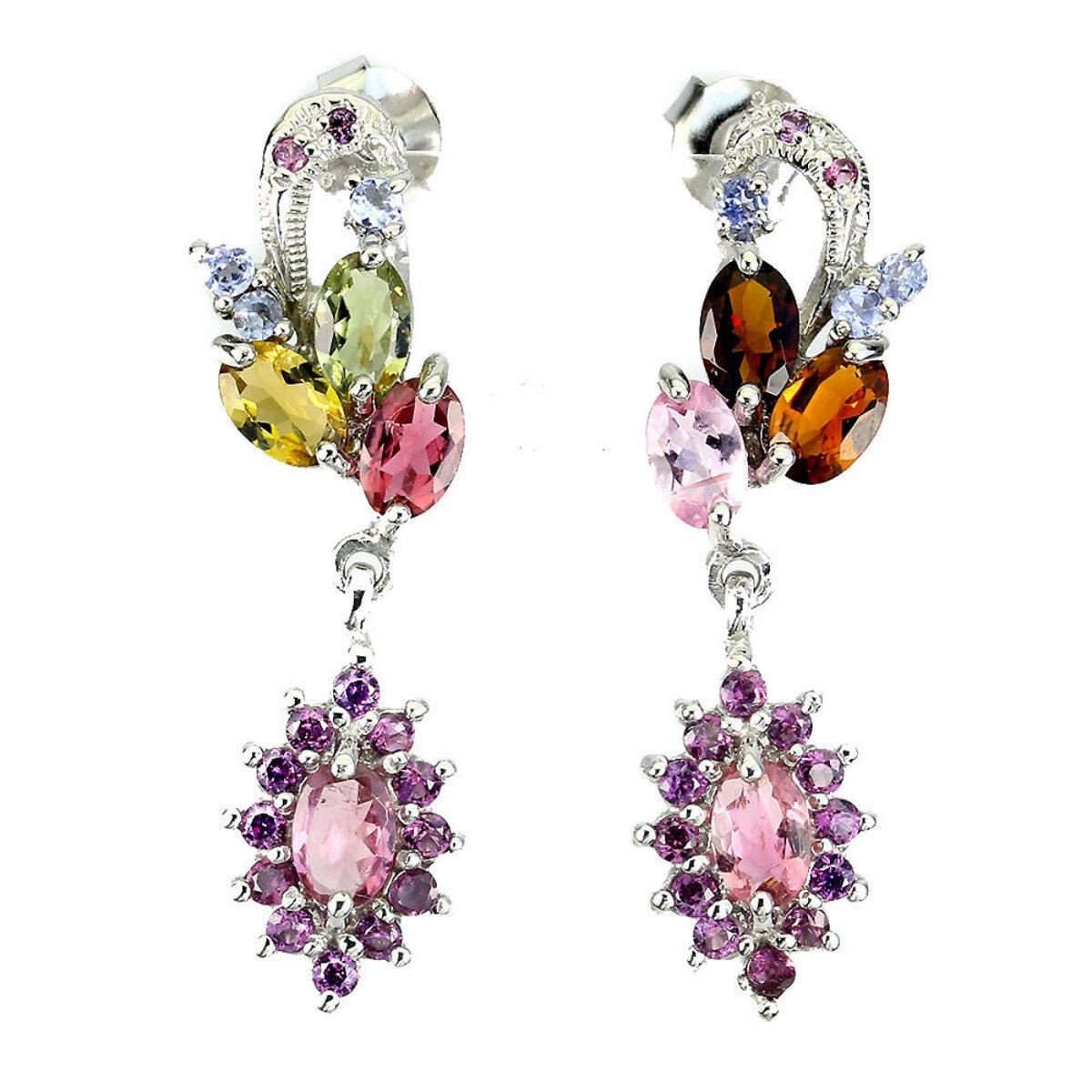 925 STERLING SILVER;PLATE-14K WHITE GOLD;MAIN STONE-TOURMALINE;OTHER GEMS-RHODOLITE GARNET, TANZANITE;TOTAL WEIGHT-6.29 GRAM (TOTAL WEIGHT OF SILVER + STONE);DIMENSION* -STONE 1.5 TO 6.0 X 4.0 MM.* FACE EARRINGS 37.0 X 40.0 MM.;MAIN STONE SHAPE-OVAL;MAIN STONE COLOR-MULTI-COLOR;CLARITY/GRADE-IF TO VVS;TREATMENT-UNHEATED;ORIGIN-AFRICA;HARDNESS-7.0-7.5;