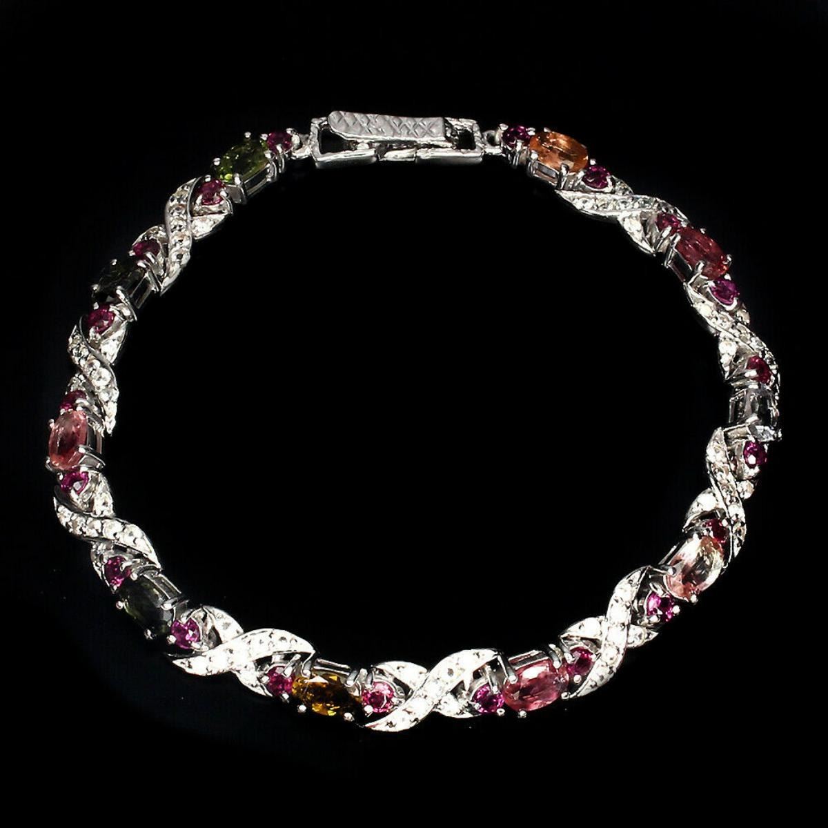 925 STERLING SILVER;PLATE-14K WHITE GOLD;LENGTH (INCHES)7.5;MAIN STONE-TOURMALINE;OTHER GEMS-RHODOLITE GARNET, WHITE TOPAZ;TOTAL WEIGHT-12.05 GRAM (TOTAL WEIGHT OF SILVER + STONE)DIMENSION* STONE 1.5 TO 6.0 X 4.0 MM. * FACE BRACELET 170.0 X 6.0 MM.;MAIN STONE SHAPE-OVAL CUT;MAIN STONE COLOR-MULTI-COLOR;CLARITY/GRADE-IF TO VVS;TREATMENT-UNHEATED;ORIGIN-BRAZIL;;HARDNESS-7.0 - 8.0;