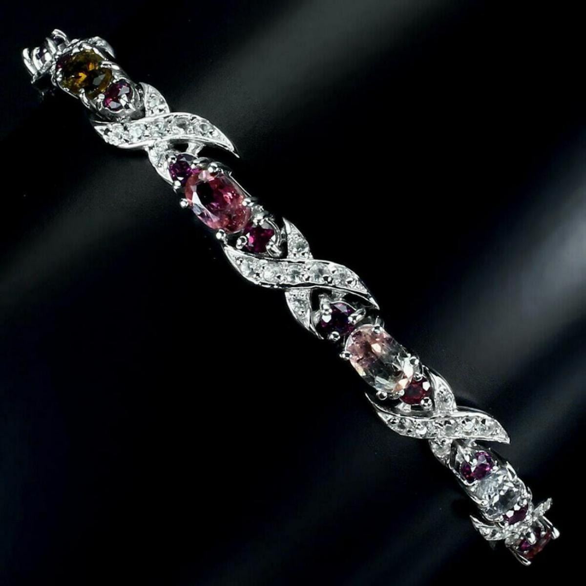 925 STERLING SILVER;PLATE-14K WHITE GOLD;LENGTH (INCHES)7.5;MAIN STONE-TOURMALINE;OTHER GEMS-RHODOLITE GARNET, WHITE TOPAZ;TOTAL WEIGHT-12.05 GRAM (TOTAL WEIGHT OF SILVER + STONE)DIMENSION* STONE 1.5 TO 6.0 X 4.0 MM. * FACE BRACELET 170.0 X 6.0 MM.;MAIN STONE SHAPE-OVAL CUT;MAIN STONE COLOR-MULTI-COLOR;CLARITY/GRADE-IF TO VVS;TREATMENT-UNHEATED;ORIGIN-BRAZIL;;HARDNESS-7.0 - 8.0;