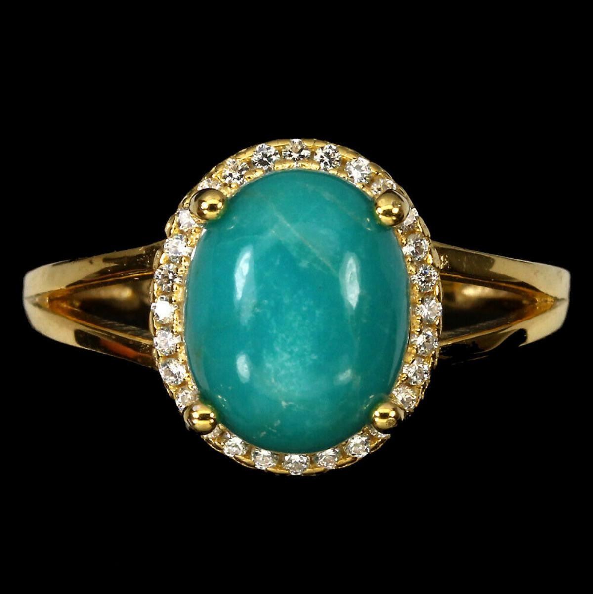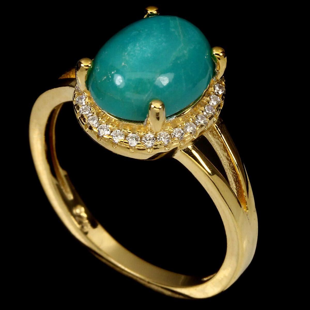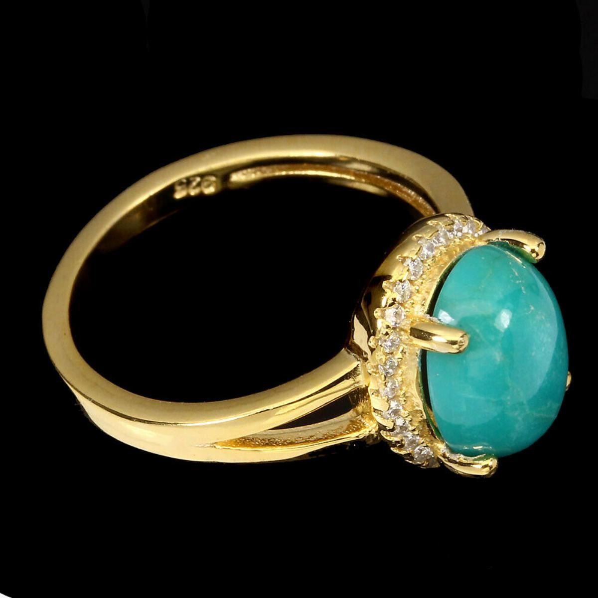 925 STERLING SILVER;PLATE....14K YELLOW GOLD;RING SIZE7(resizeable)MAIN STONETURQUOISE;OTHER GEMSCUBIC ZIRCONIATOTAL WEIGHT16.88 CT (TOTAL WEIGHT OF SILVER + STONE)DIMENSION* STONE 10.0 X 8.0 MM. * CZ 1.0 MM. * RING SIZE 7.0 * FACE RING 12.0 X 10.0 MM.;MAIN STONE SHAPEOVAL CABOCHON;MAIN STONE COLORTOP RICH BLUE;LUSTERELEGANT;TREATMENTUNHEATED;ORIGINARIZONA;HARDNESS5