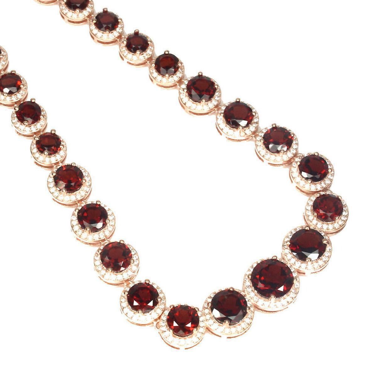925 STERLING SILVER;PLATE...14K ROSE GOLD;LENGTH (INCHES)...17.5;MAIN STONE....MOZAMBIQUE GARNET;OTHER GEMS...CUBIC ZIRCONIA;TOTAL WEIGHT...150.76 CT (TOTAL WEIGHT OF SILVER + STONE)DIMENSION* STONE 5.0 TO 8.0 MM. * CZ 1.0 MM. * STONES PART LENGTH 210.0 X 11.0 MM.;MAIN STONE SHAPE-ROUND CUT;MAIN STONE COLOR-TOP RICH RED;CLARITY/GRADEIF TO VVS;LUSTER-PRECIOUS;TREATMENT-UNHEATED;ORIGIN-AFRICA;HARDNESS-7.0 - 7.5;