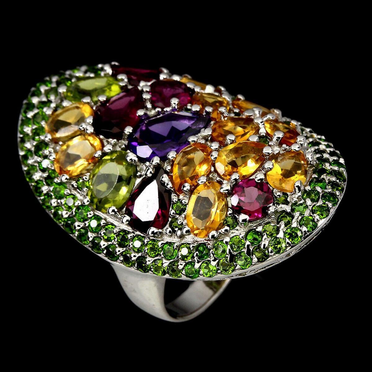 925 STERLING SILVER;PLATE-14K WHITE GOLD;RING SIZE-8(RESIZABLE);MAIN STONE-AMETHYST;OTHER GEMS-CHROME DIOPSIDE, CITRINE, PERIDOT, RHODOLITE GARNET;TOTAL WEIGHT-14.16 GRAM (TOTAL WEIGHT OF SILVER + STONE);DIMENSION-* STONE 1.5 TO 9.0 X 6.0 MM. * RING SIZE 8.0 * FACE RING 39.0 X 25.0 MM.;MAIN STONE SHAPE-PEAR;MAIN STONE COLOR- PURPLE;CLARITY/GRADE-IF;TREATMENT-UNHEATED;ORIGIN-URUGUAY;HARDNESS-7;