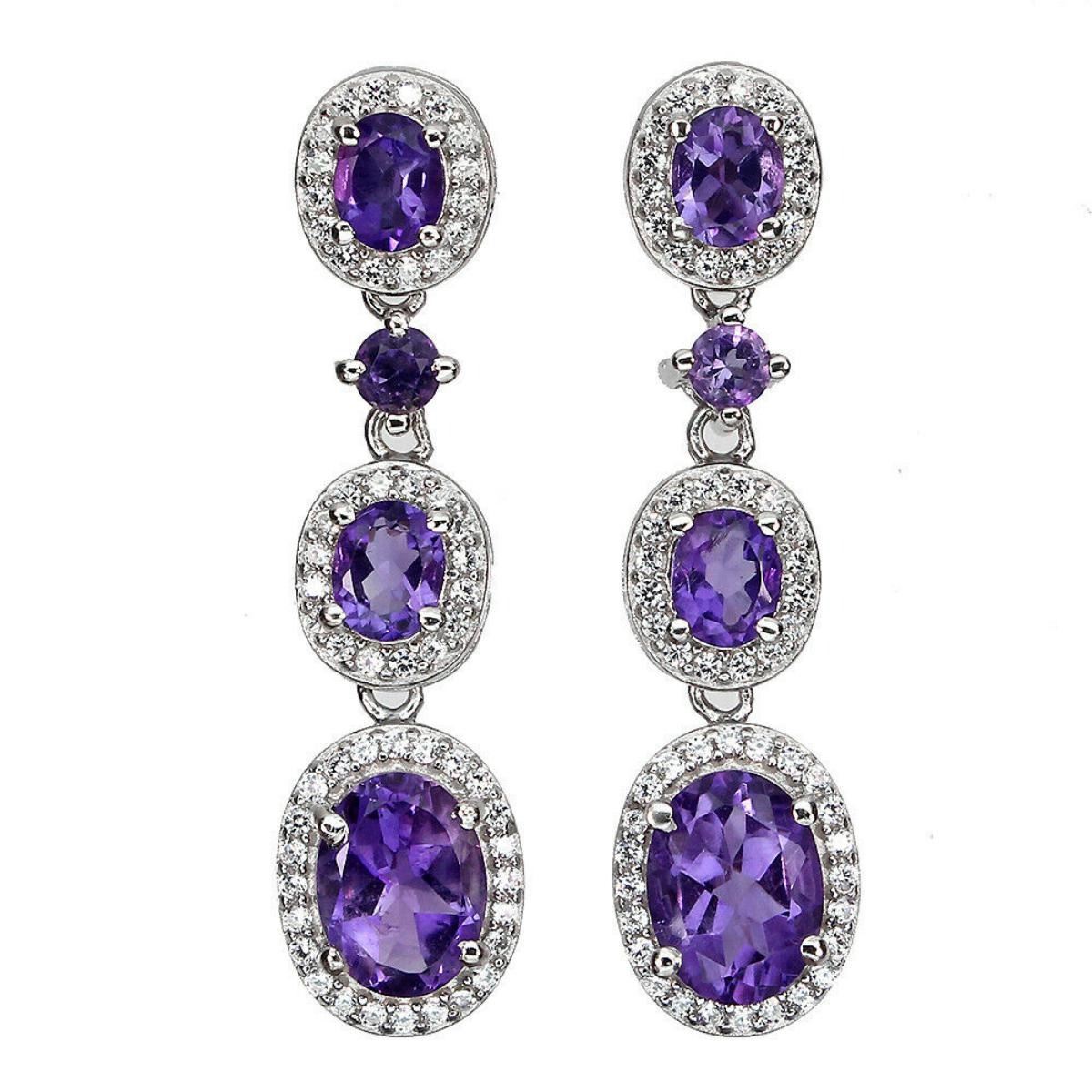925 STERLING SILVER;PLATE-14K WHITE GOLD;MAIN STONE-AMETHYST;OTHER GEMS-WHITE TOPAZ;TOTAL WEIGHT-6.08 GRAM (TOTAL WEIGHT OF SILVER + STONE);DIMENSION-* STONE 2.5 TO 8.0 X 6.0 MM.* FACE EARRINGS 32.0 X 8.0 MM.;MAIN STONE SHAPE-OVAL CUT;MAIN STONE COLOR-RICH PURPLE;CLARITY/GRADE-IF TO VVS;TREATMENT-UNHEATED;ORIGIN-URUGUAY;HARDNESS- 7;