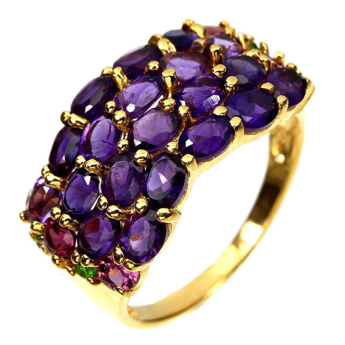 925 STERLING SILVER;PLATE-14K YELLOW GOLD;RING SIZE -8(RESIZABLE);MAIN STONE-AMETHYST;OTHER GEMS-CHROME DIOPSIDE, RHODOLITE GARNET;TOTAL WEIGHT-3.11 GRAM (TOTAL WEIGHT OF SILVER + STONE);DIMENSION-* STONE 2.0 TO 4.0 X 3.0 MM. * RING SIZE 8.0 * FACE RING 23.0 X 12.0 MM.;MAIN STONE SHAPE-OVAL CUT;MAIN STONE COLOR-PURPLE;CLARITY/GRADE-IF;TREATMENT-UNHEATED;ORIGIN-URUGUAY;HARDNESS-7;