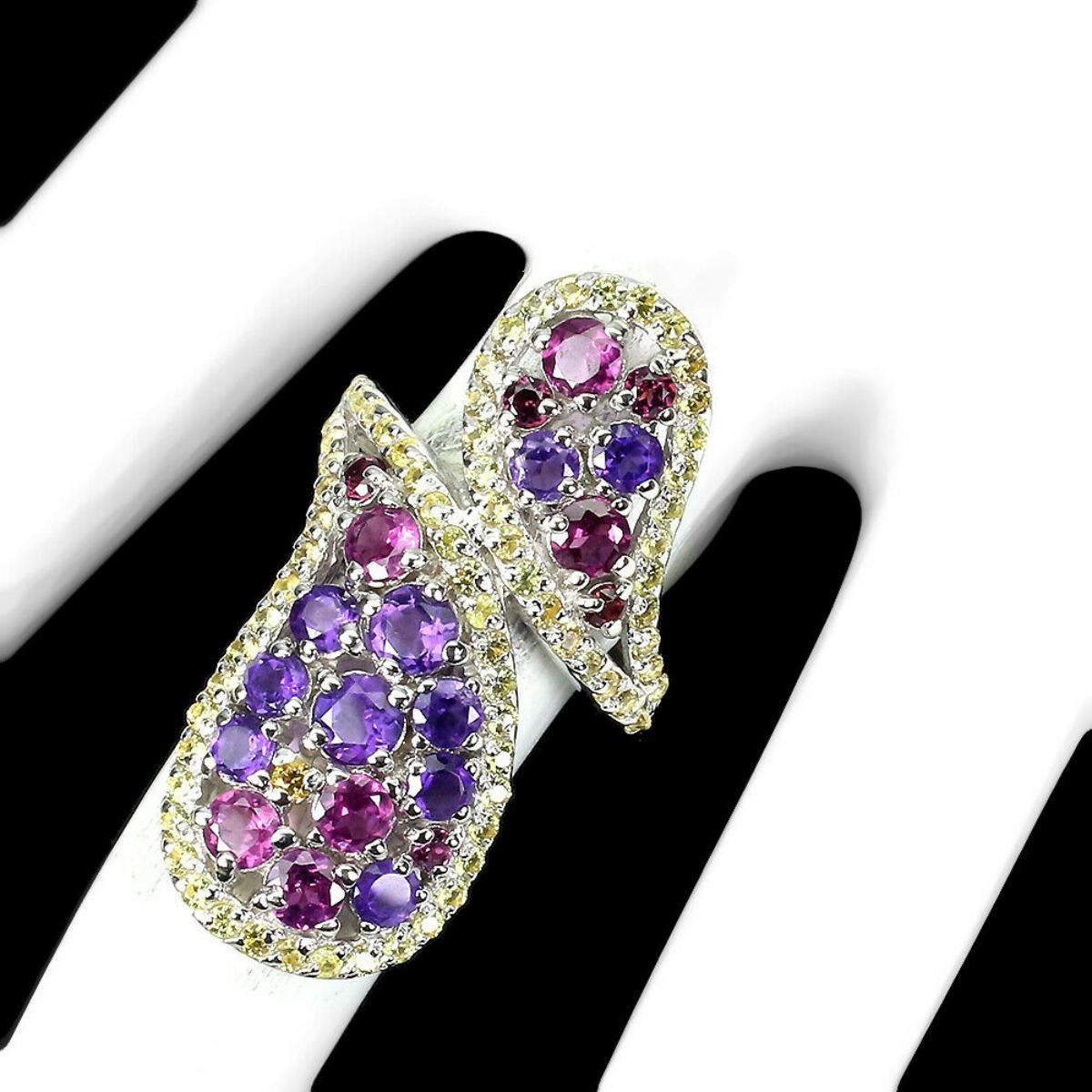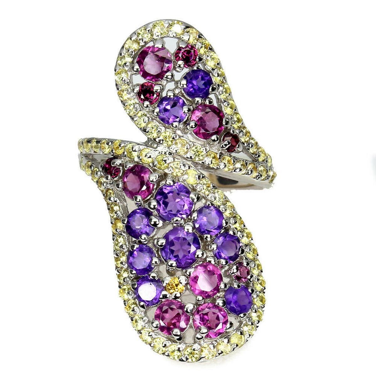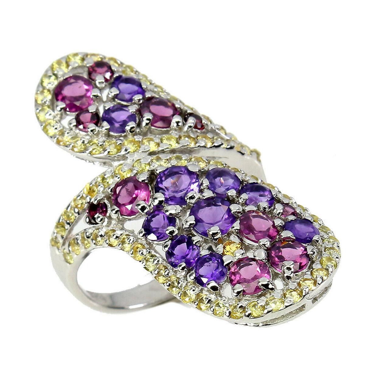 925 STERLING SILVER;PLATE-14K WHITE GOLD;RING SIZE-8(RESIZABLE);MAIN STONE-AMETHYST;OTHER GEMS-RHODOLITE GARNET, SAPPHIRE;TOTAL WEIGHT-6.25 GRAM (TOTAL WEIGHT OF SILVER + STONE);DIMENSION-* STONE 1.0 TO 3.5 MM. * RING SIZE 8.0 * FACE RING 35.0 X 20.0 MM.;MAIN STONE SHAPE-ROUND CUT;MAIN STONE COLOR- PURPLE;CLARITY/GRADE-IF TO VVS;TREATMENT-UNHEATED;ORIGIN-URUGUAY;HARDNESS-7;