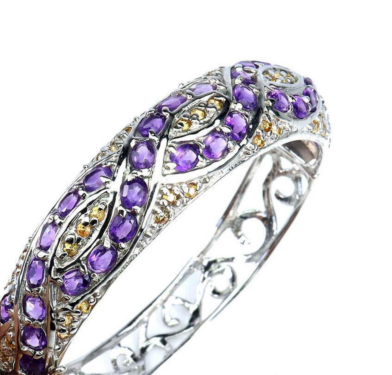 925 STERLING SILVER;PLATE-14K WHITE GOLD;LENGTH (INCHES)2.1;MAIN STONE-AMETHYST;OTHER GEMS-SAPPHIRE ;TOTAL WEIGHT-22.78 GRAM (TOTAL WEIGHT OF SILVER + STONE);DIMENSION-* STONE 2.0 TO 5.0 X 4.0 MM.;* DIAMETER 2.1 INCHES.* FACE BANGLE 60.0 X 14.0 MM.;MAIN STONE SHAPE-OVAL CUT;MAIN STONE COLOR- PURPLE;CLARITY/GRADE-IF TO VVS;TREATMENT-UNHEATED;ORIGIN-URUGUAY;HARDNESS-7;