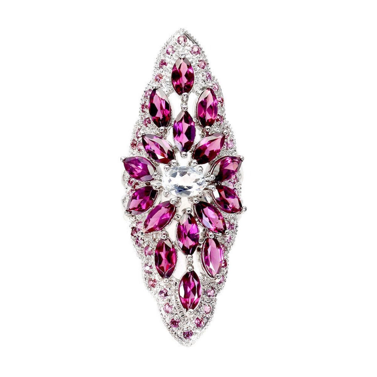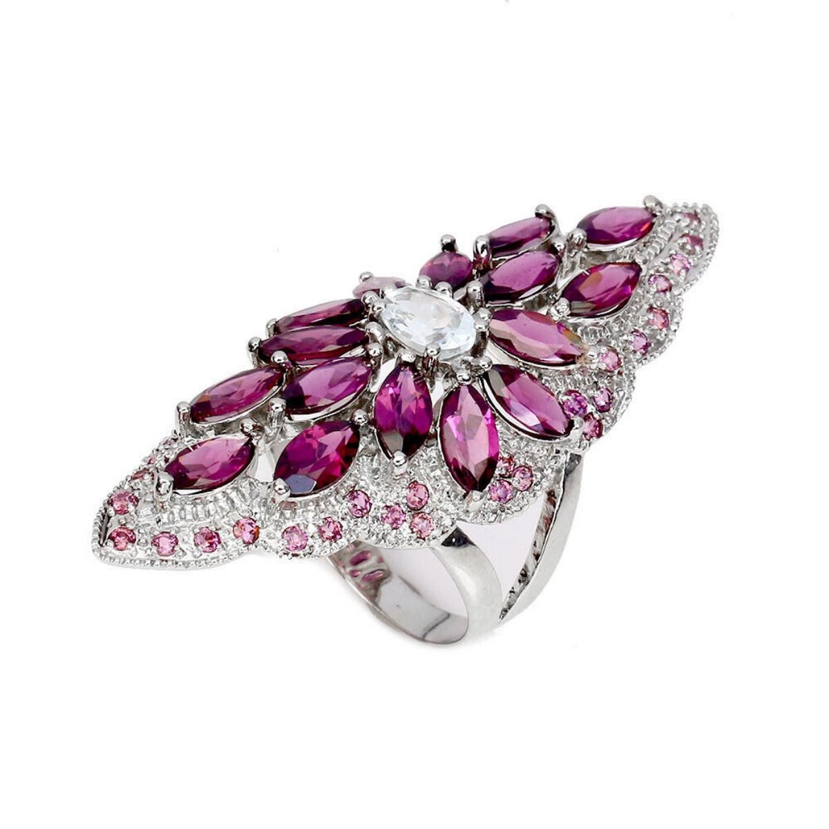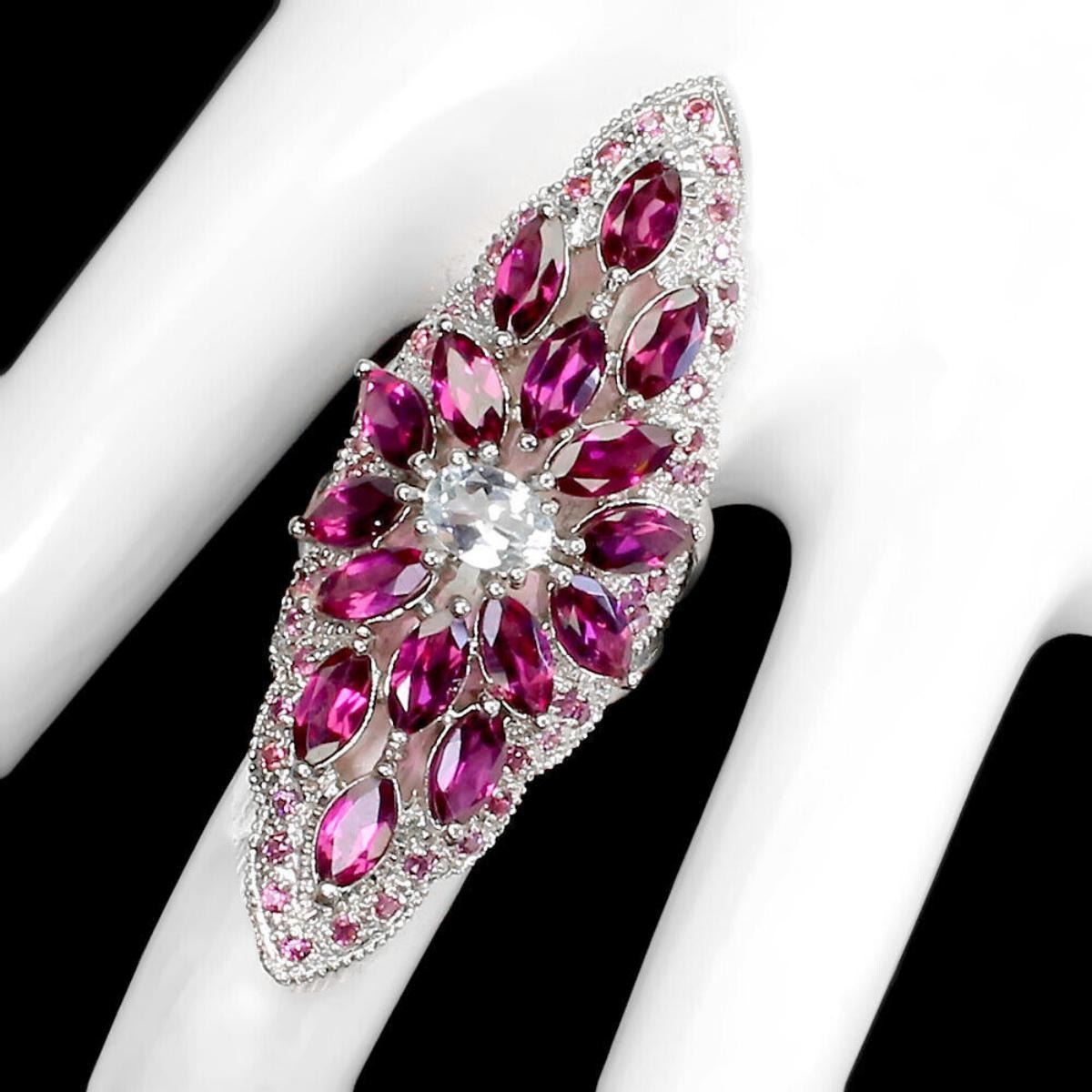 925 STERLING SILVER;PLATE-14K WHITE GOLD;RING SIZE-9(RESIZABLE);MAIN STONE-AQUAMARINE;OTHER GEMS-RHODOLITE GARNET;TOTAL WEIGHT-10.7 GRAM (TOTAL WEIGHT OF SILVER + STONE);DIMENSION-* STONE 1.5 TO 7.0 X 5.0 MM.* RING SIZE 9.0* FACE RING 52.0 X 20.0 MM.;MAIN STONE SHAPE-OVAL CUT;MAIN STONE COLOR- BLUE;CLARITY/GRADE-IF TO VVS;TREATMENT-UNHEATED;ORIGIN-AFRICA;HARDNESS-7;