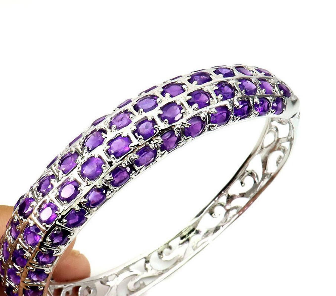 925 STERLING SILVER;PLATE-14K WHITE GOLD;MAIN STONE-AMETHYST;TOTAL WEIGHT-21.9 GRAM (TOTAL WEIGHT OF SILVER + STONE)DIMENSION-* STONE 4.0 X 3.0 MM. * DIAMETER 2.2 X 2.1 INCHES. * FACE BANGLE- 64.0 X 12.0 MM.;MAIN STONE SHAPE-OVAL CUT;MAIN STONE COLOR- RICH PURPLE;CLARITY/GRADE-IF TO VVS;TREATMENT-UNHEATED;ORIGIN-BRAZIL;HARDNESS-7;