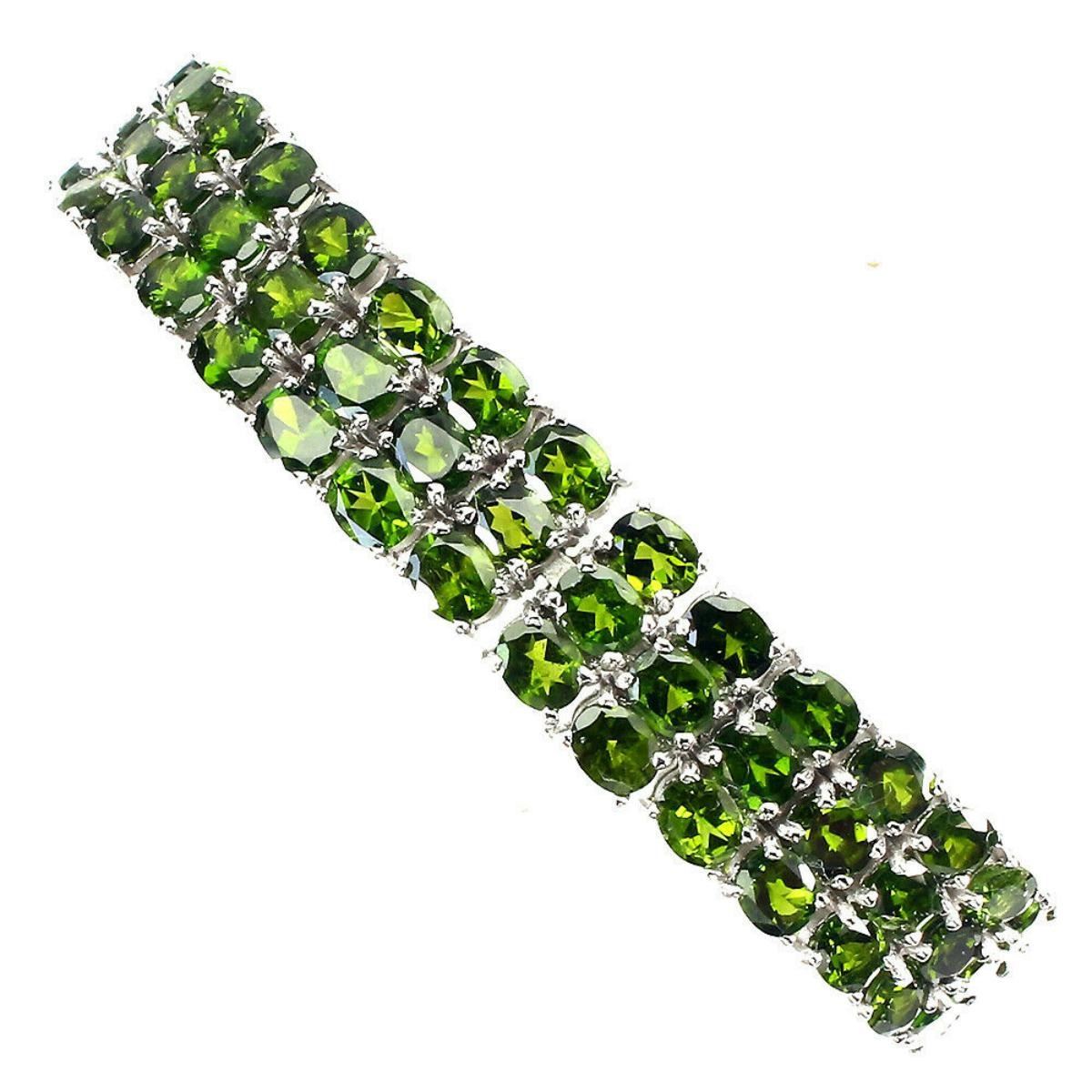 925 STERLING SILVER;PLATE-14K WHITE GOLD;LENGTH (INCHES)-7.5;MAIN STONE-CHROME DIOPSIDE;TOTAL WEIGHT-31.49 GRAM (TOTAL WEIGHT OF SILVER + STONE);DIMENSION-* STONE 5.0 X 4.0 MM. * TOTAL LENGTH 7.5 INCHES. * FACE BRACELET -170.0 X 12.0 MM.;MAIN STONE SHAPE-OVAL CUT;MAIN STONE COLOR-GREEN;CLARITY/GRADE-IF TO VVS;TREATMENT-UNHEATED;ORIGIN-RUSSIA;HARDNESS-5.0 - 5.5;