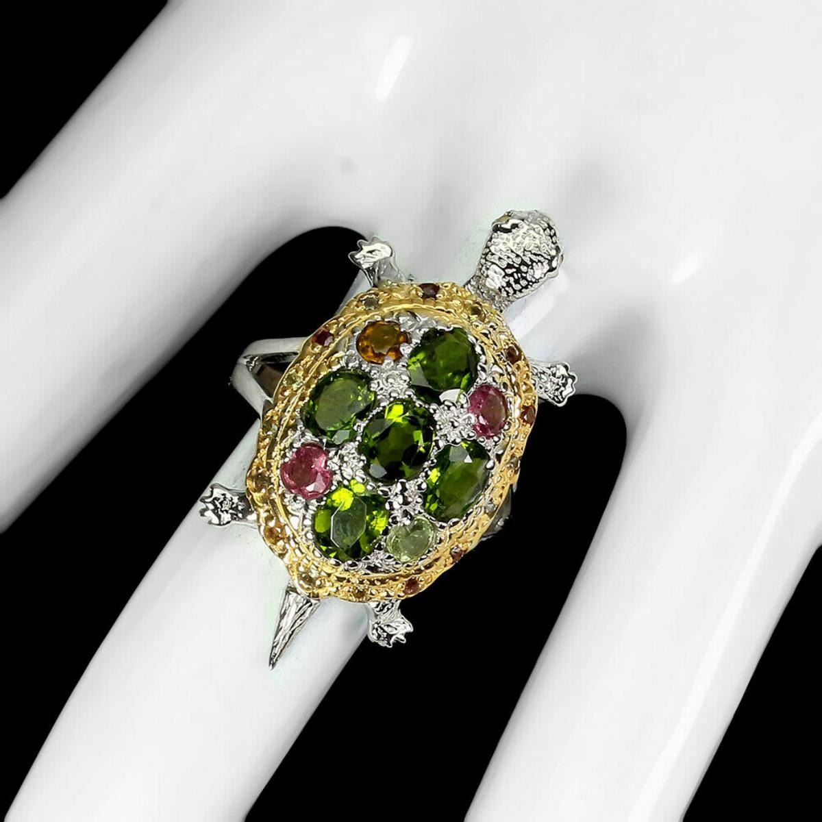 925 STERLING SILVER;PLATE-2-TONE WHITE & YELLOW 14K GOLD;RING SIZE-7(RESIZABLE);MAIN STONE-CHROME DIOPSIDE;OTHER GEMS-SAPPHIRE, TOURMALINE;TOTAL WEIGHT-6.51 GRAM (TOTAL WEIGHT OF SILVER + STONE);DIMENSION-* STONE 1.0 TO 5.0 X 4.0 MM. * RING SIZE 7.5 * FACE RING 32.0 X 15.0 MM.;MAIN STONE SHAPE-OVAL; MAIN STONE COLOR- GREEN;CLARITY/GRADE-IF TO VVS;TREATMENT-UNHEATED;ORIGIN-RUSSIA;HARDNESS-5;