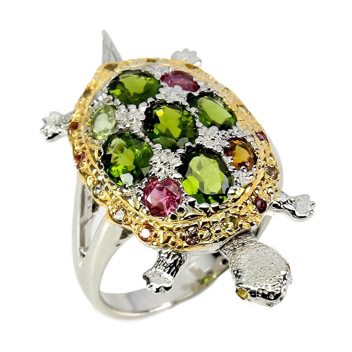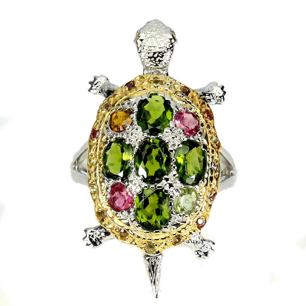 925 STERLING SILVER;PLATE-2-TONE WHITE & YELLOW 14K GOLD;RING SIZE-7(RESIZABLE);MAIN STONE-CHROME DIOPSIDE;OTHER GEMS-SAPPHIRE, TOURMALINE;TOTAL WEIGHT-6.51 GRAM (TOTAL WEIGHT OF SILVER + STONE);DIMENSION-* STONE 1.0 TO 5.0 X 4.0 MM. * RING SIZE 7.5 * FACE RING 32.0 X 15.0 MM.;MAIN STONE SHAPE-OVAL; MAIN STONE COLOR- GREEN;CLARITY/GRADE-IF TO VVS;TREATMENT-UNHEATED;ORIGIN-RUSSIA;HARDNESS-5;