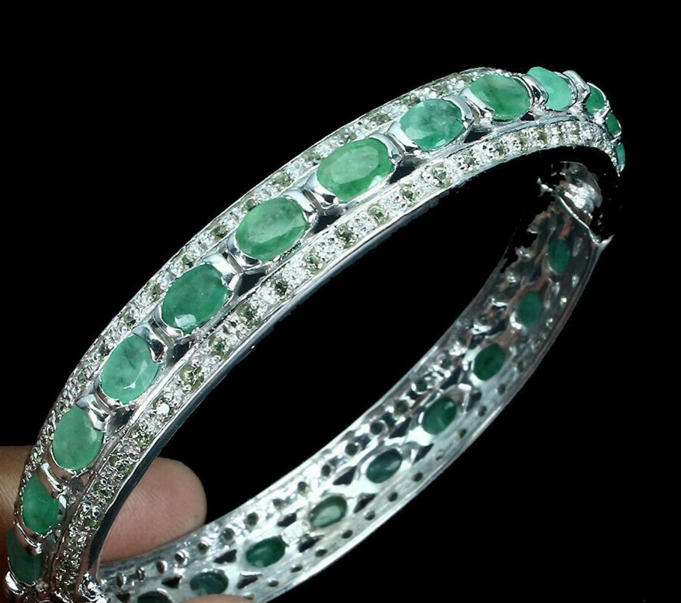 925 STERLING SILVER;PLATE-14K WHITE GOLD;LENGTH (INCHES)2.1;MAIN STONE-EMERALD;OTHER GEMS-SAPPHIRE;TOTAL WEIGHT-24.44 GRAM (TOTAL WEIGHT OF SILVER + STONE)DIMENSION* STONE 1.5 TO 6.0 X 4.0 MM. * DIAMETER 2.1 INCHES. * FACE BANGLE -65.0 X 9.0 MM.;MAIN STONE SHAPE-OVAL CUT;MAIN STONE COLOR- GREEN;-TREATMENT-UNHEATED;ORIGIN-BRAZIL;HARDNESS-7.5 - 8.0-;