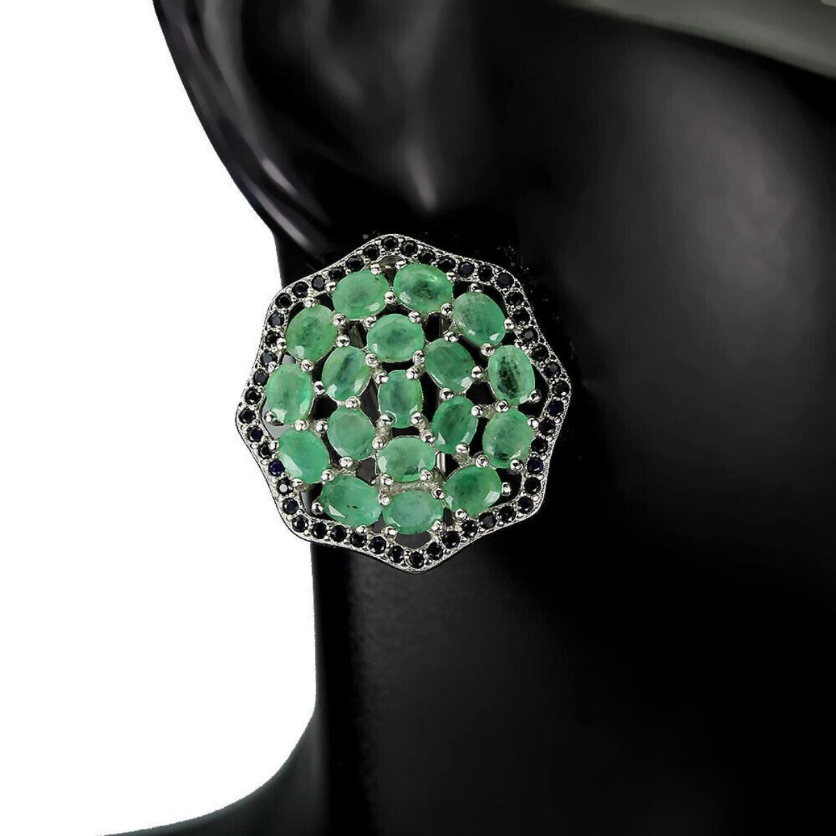 925 STERLING SILVER;PLATE-14K WHITE GOLD;MAIN STONE-EMERALD;OTHER GEMS-SAPPHIRE;TOTAL WEIGHT-7.47 GRAM (TOTAL WEIGHT OF SILVER + STONE);DIMENSION-* STONE 1.0 TO 4.0 X 3.0 MM. * FACE EARRINGS 23.0 X 22.0 MM.;MAIN STONE SHAPE-OVAL;MAIN STONE COLOR-GREEN;TREATMENT-UNHEATED;ORIGIN-BRAZIL;