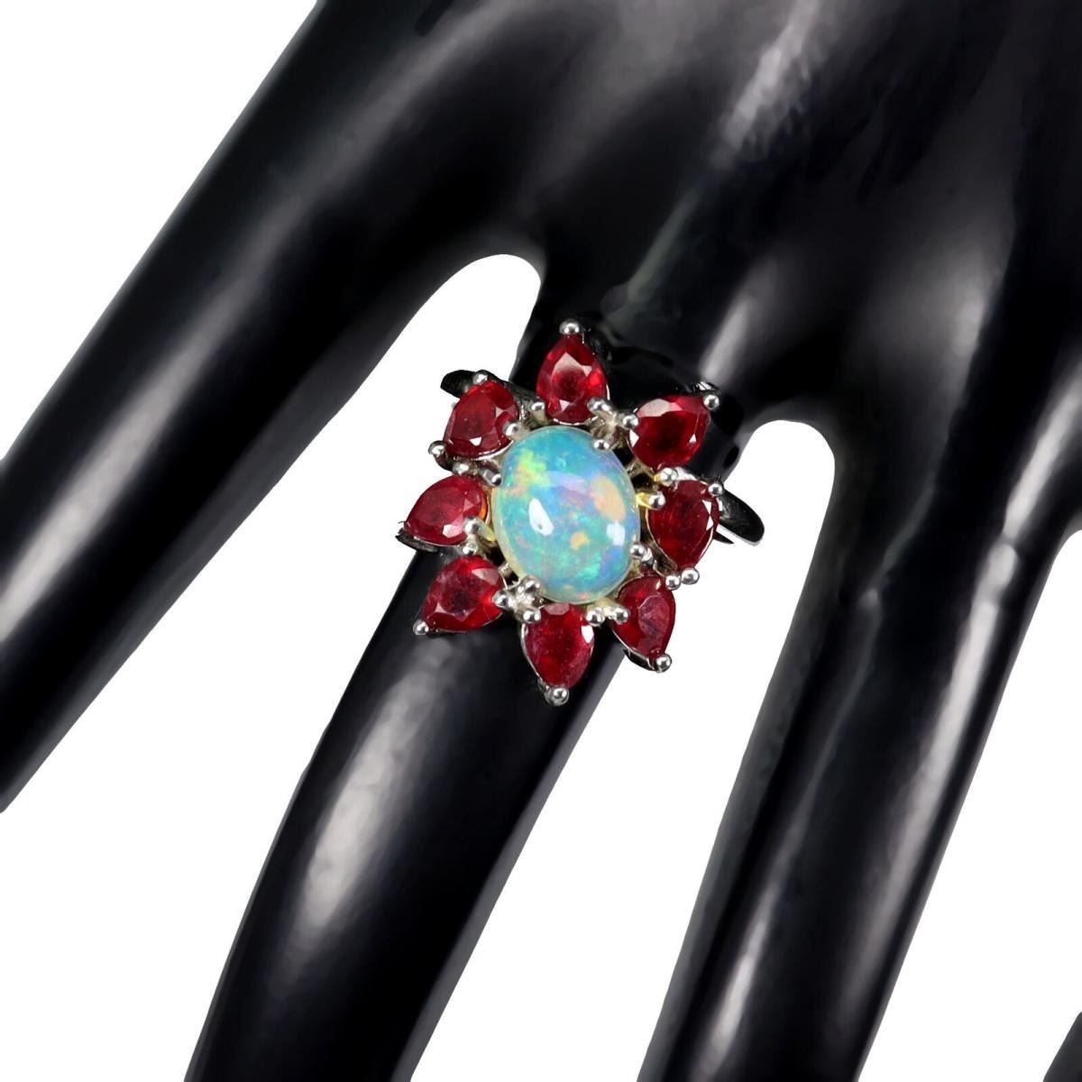 925 STERLING SILVER;PLATE14K WHITE GOLD;RING SIZE;Resizeable---8.0;MAIN STONEFIRE OPAL;OTHER GEMSRUBY;TOTAL WEIGHT4.92 GRAM (TOTAL WEIGHT OF SILVER + STONE)DIMENSION* STONE 5.0 X 4.0 TO 10.0 X 8.0 MM.;* ;* FACE RING 20.0 X 18.0 MM;.MAIN STONE SHAPEOVAL CUT;MAIN STONE COLOR =RAINBOW FULL FLASH;TREATMENT UNHEATED;ORIGIN ETHIOPIA;