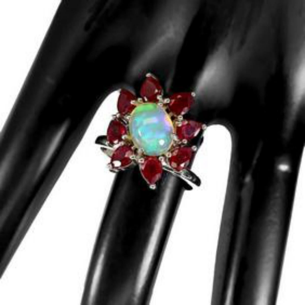 925 STERLING SILVER;PLATE14K WHITE GOLD;RING SIZE;Resizeable---9.5;MAIN STONEFIRE OPAL;OTHER GEMSRUBY;TOTAL WEIGHT4.92 GRAM (TOTAL WEIGHT OF SILVER + STONE)DIMENSION* STONE 5.0 X 4.0 TO 10.0 X 8.0 MM.;* RING 9.5 SIZE;* FACE RING 20.0 X 18.0 MM;.MAIN STONE SHAPEOVAL CUT;MAIN STONE COLOR =RAINBOW FULL FLASH;TREATMENT UNHEATED;ORIGIN ETHIOPIA;