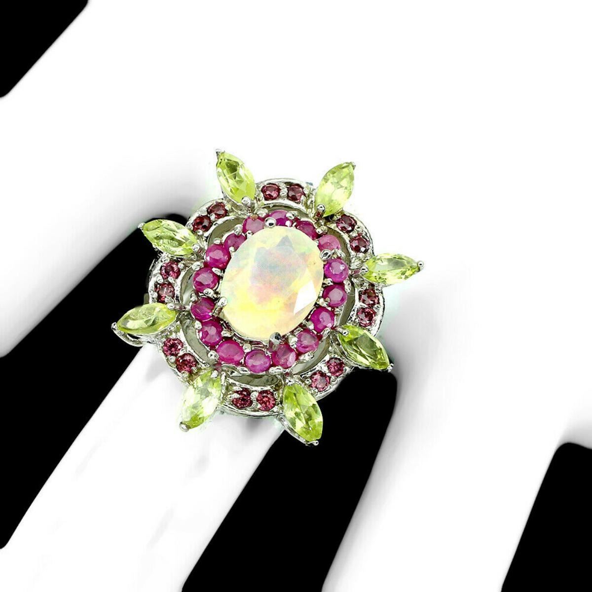 925 STERLING SILVER;PLATE-14K WHITE GOLD;RING SIZE-8.5(RESIZEABLE);MAIN STONE-FIRE OPAL;OTHER GEMS-PERIDOT, RHODOLITE GARNET, RUBY;TOTAL WEIGHT-5.98 GRAM (TOTAL WEIGHT OF SILVER + STONE);DIMENSION-* STONE 1.0 TO 8.0 X 6.0 MM. * RING SIZE 8.5 * FACE RING 25.0 X 21.0 MM.;MAIN STONE SHAPE-OVAL CUT;MAIN STONE COLORRAINBOW FULL FLASH;CLARITY/GRADE-IF;TREATMENT-UNHEATED;ORIGIN-ETHIOPIA;HARDNESS-5;
